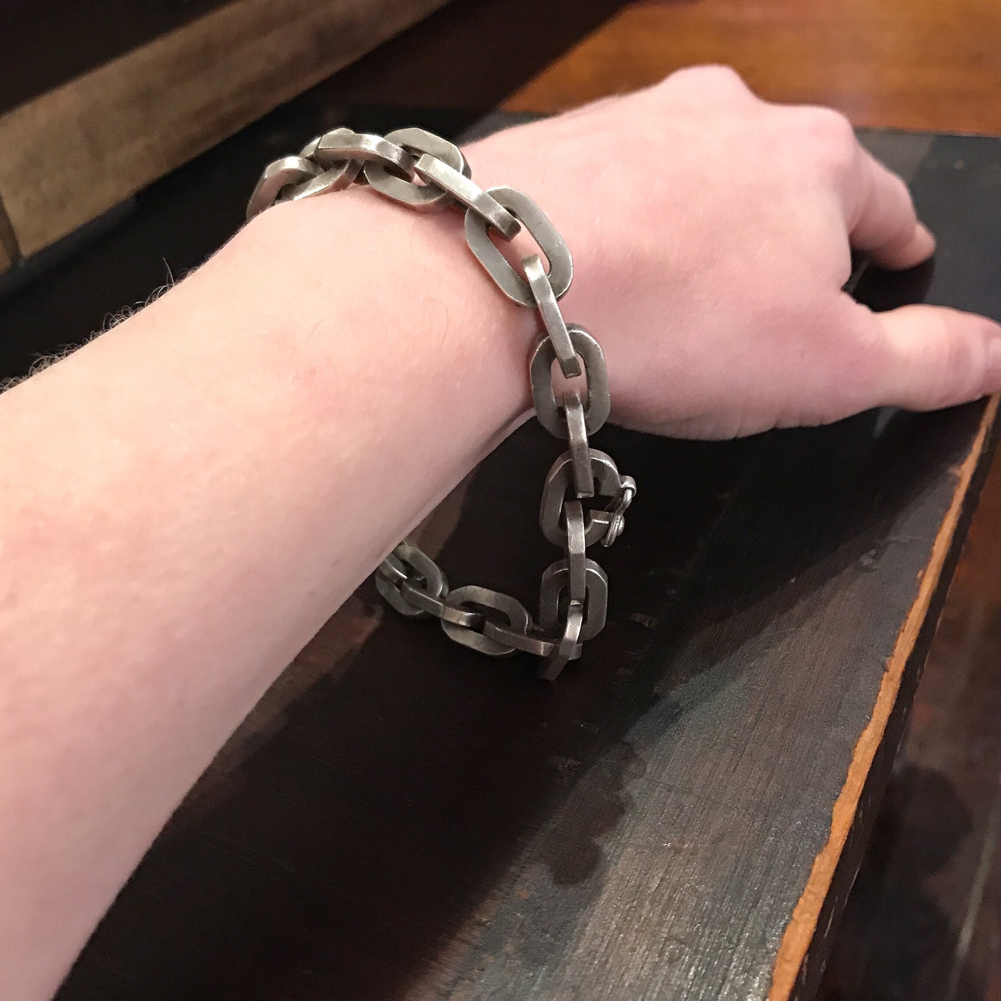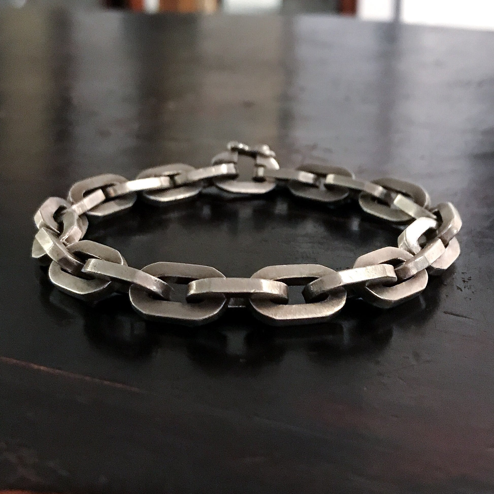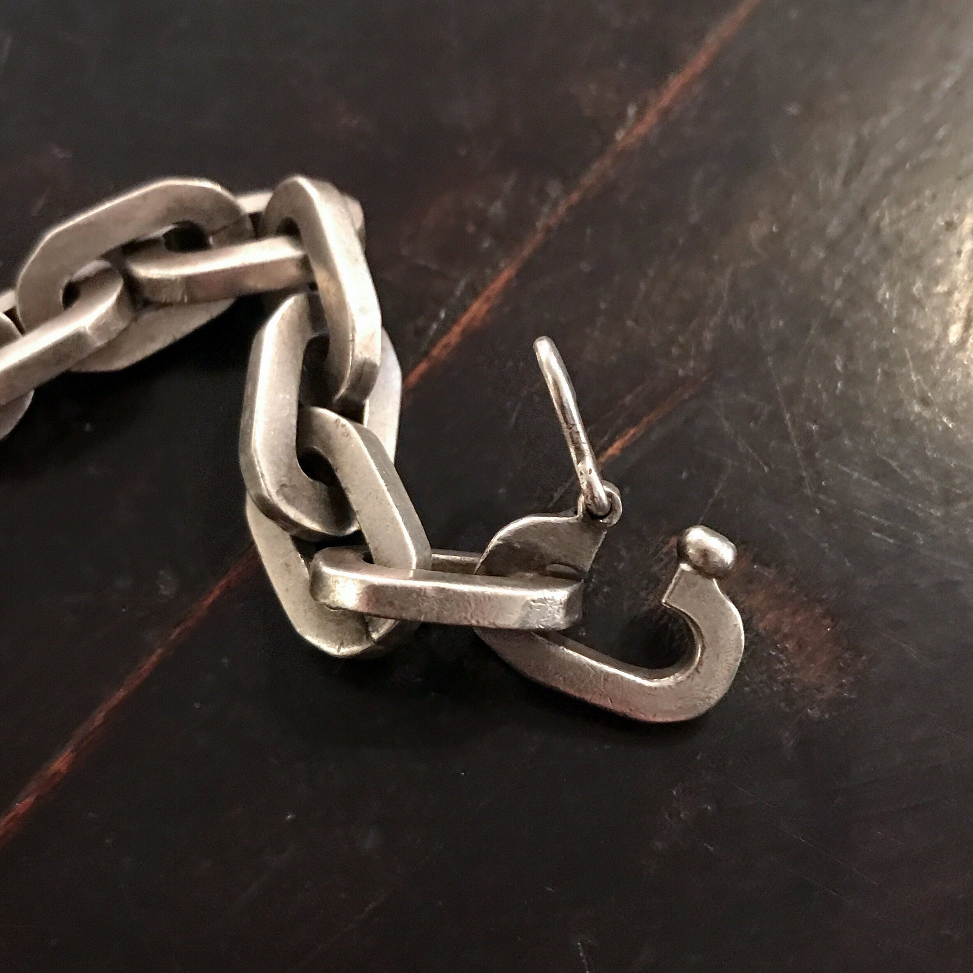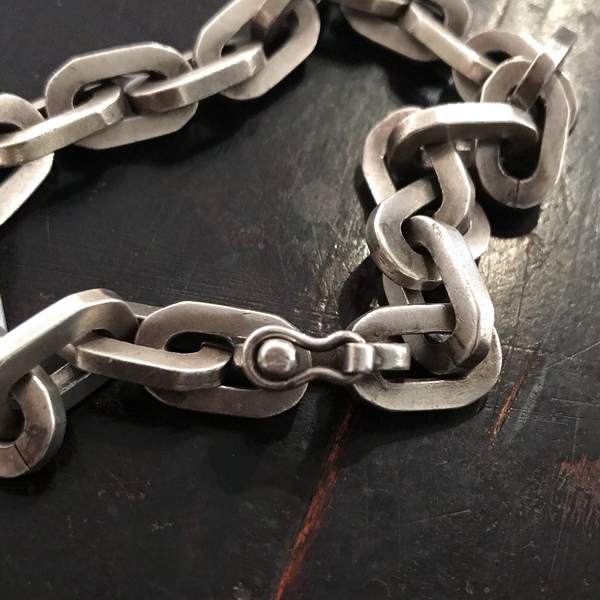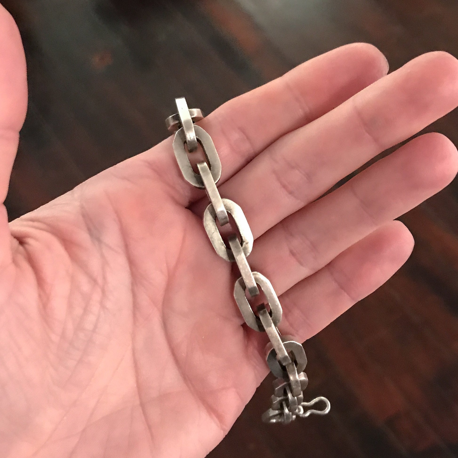 Now if this bracelet DOES fit you, please read on--this badass piece of metal features a very precise oval flat link with slightly faceted corners. Made in the Taxco region of Mexico in solid sterling silver, circa 1980's. It is very dense and heavy at 67 grams. It is also so incredibly chic, modern, classic, elegant, tough, edgy--this bracelet has it all!