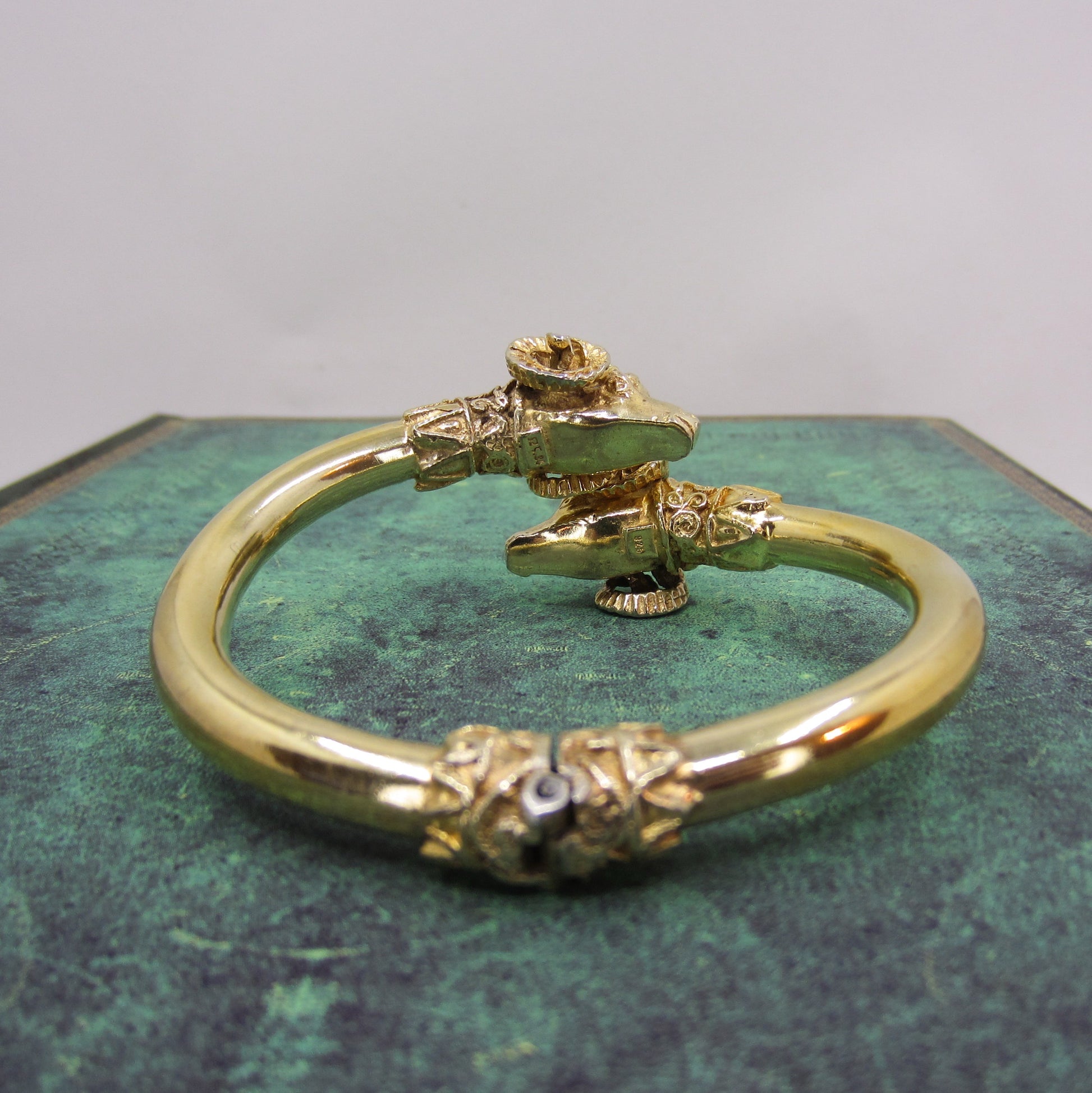 Calling all Aries this vintage bangle may be for you! This fab bracelet features two opposing ram's heads designed in an Etruscan style in gilt sterling silver. To wear it, the ram's heads pull apart via a spring hinge at the base. Made circa 1990s and fits a medium to large wrist best.