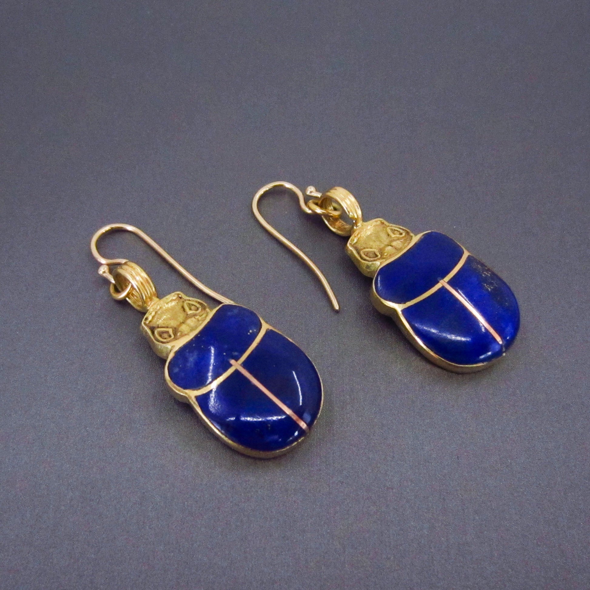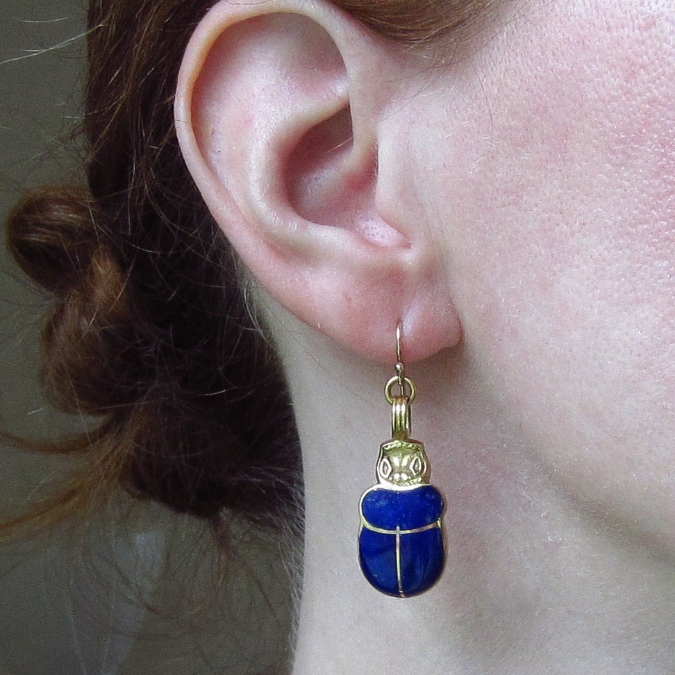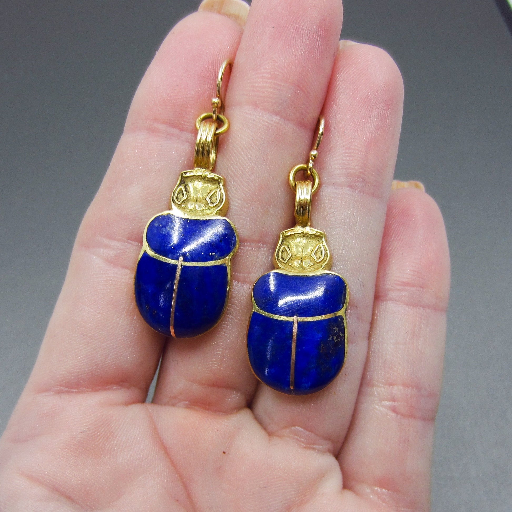 These gorgeous vintage scarab earrings are set with vibrant lapis in 18k yellow gold and were made cIrca 1990.