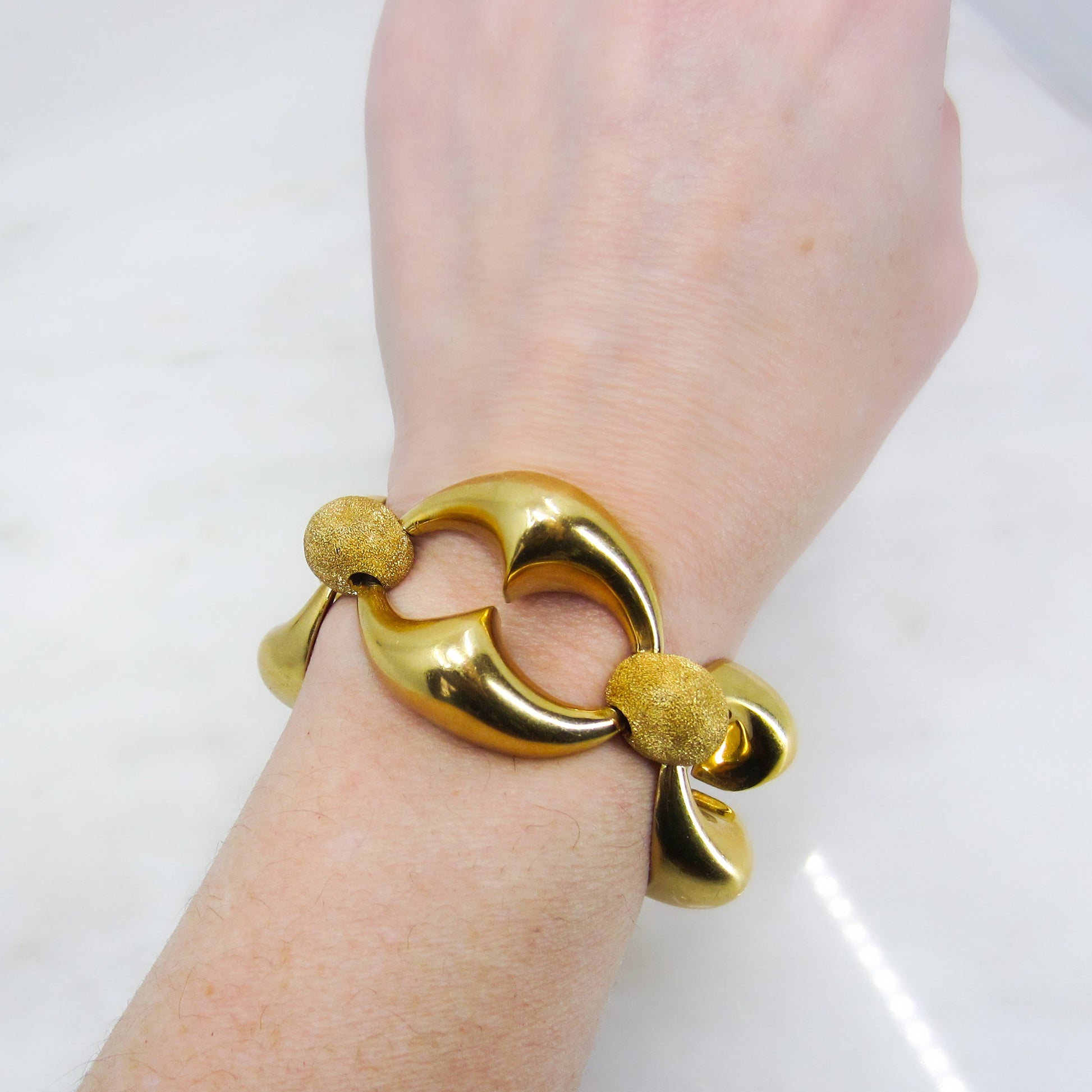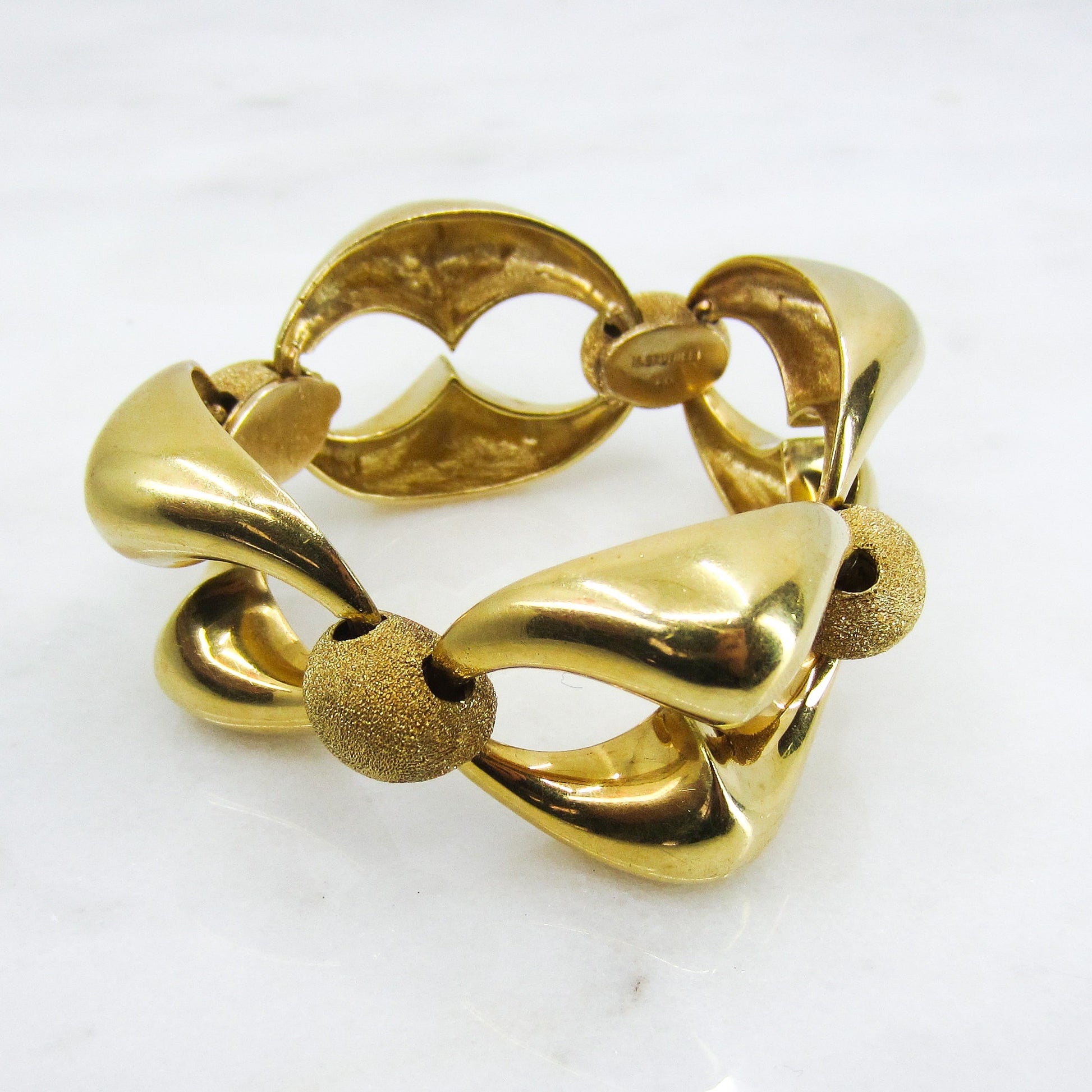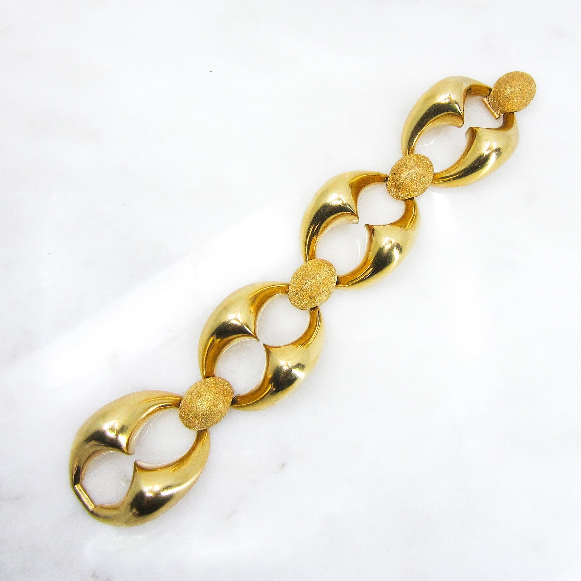 This incredibly glamorous and heavy Mid-Century bracelet came from a local collection full of wonderfully pieces and this is one of the crown jewels of the group! Made by Belgian jeweler Marcel Bruyneel circa 1960's, this bracelet is designed as an abstract and very high relief mariner's link in 18k gold. Four huge mariner links with alternating textured links, one hiding a very secure clasp. This is such a power piece that has it all--it's regal, it's chic, it's edgy and it's bold, I hope her new caretaker wears it very often!