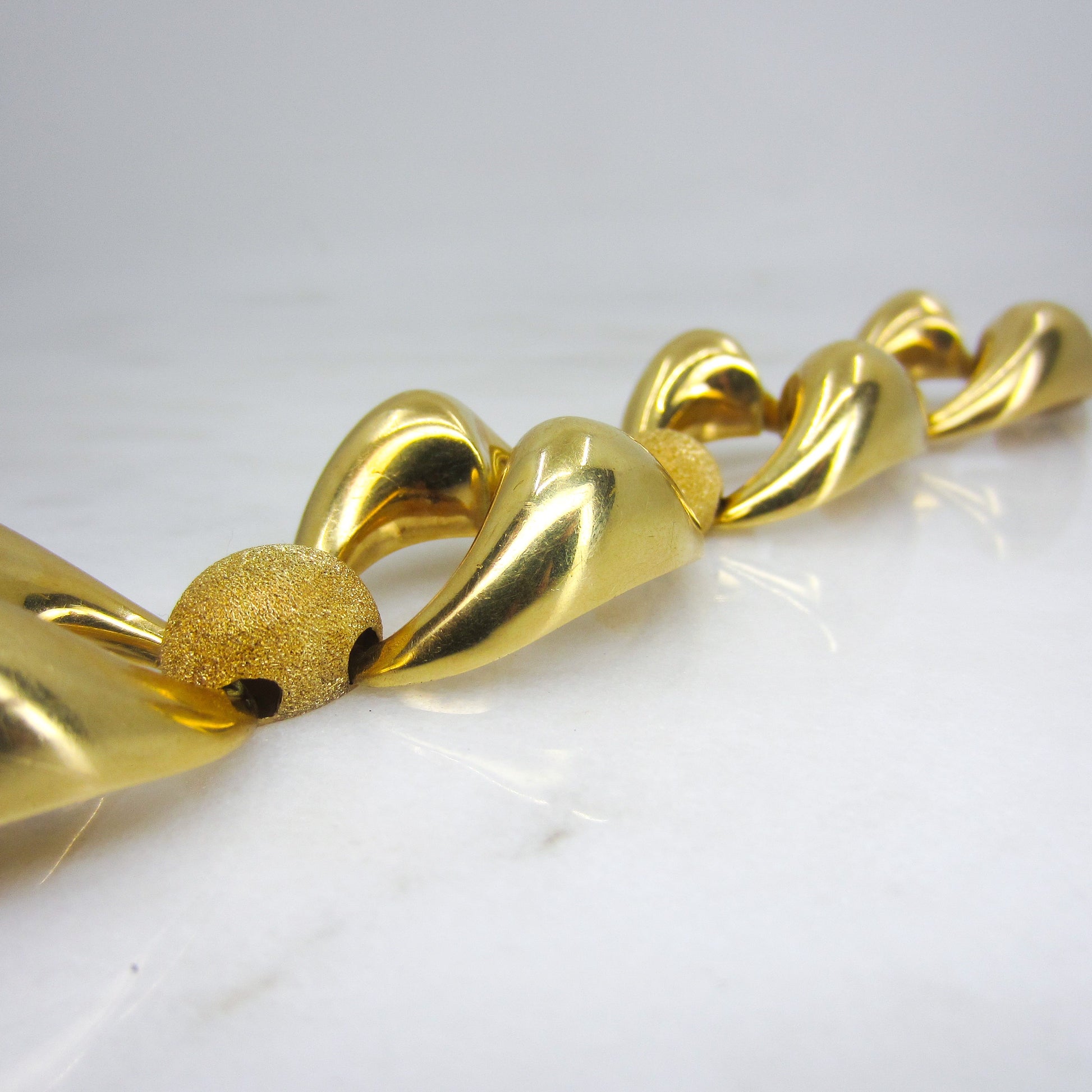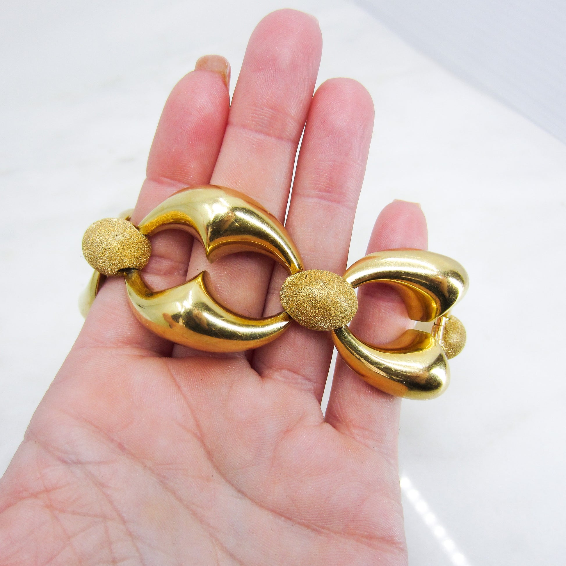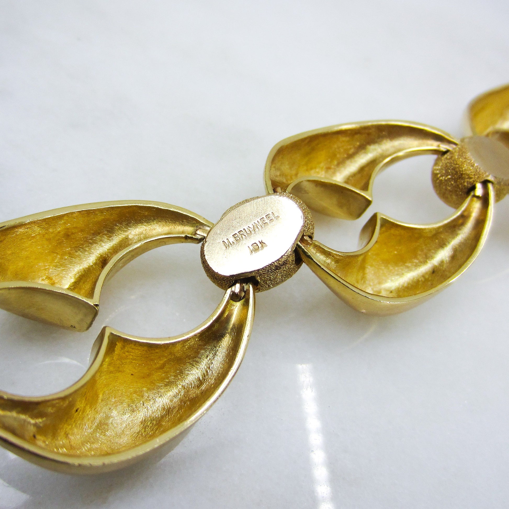 This incredibly glamorous and heavy Mid-Century bracelet came from a local collection full of wonderfully pieces and this is one of the crown jewels of the group! Made by Belgian jeweler Marcel Bruyneel circa 1960's, this bracelet is designed as an abstract and very high relief mariner's link in 18k gold. Four huge mariner links with alternating textured links, one hiding a very secure clasp. This is such a power piece that has it all--it's regal, it's chic, it's edgy and it's bold, I hope her new caretaker wears it very often!