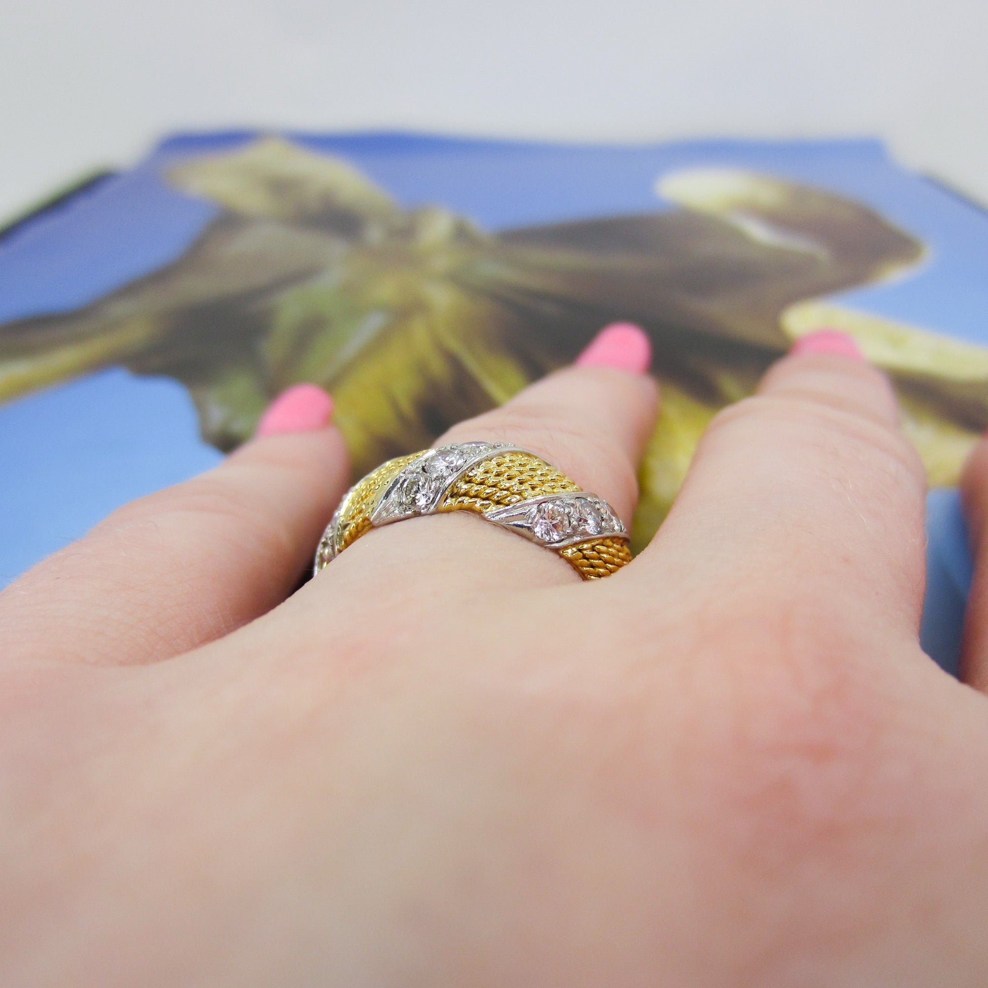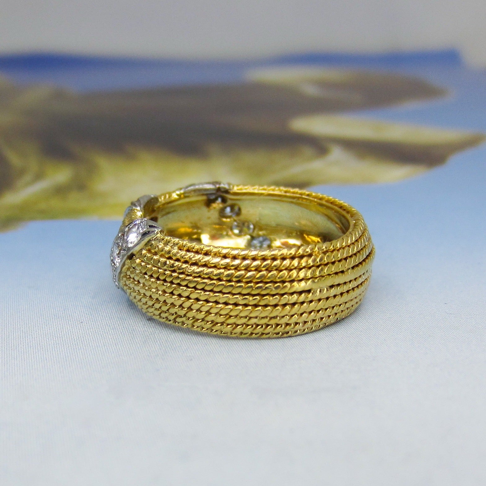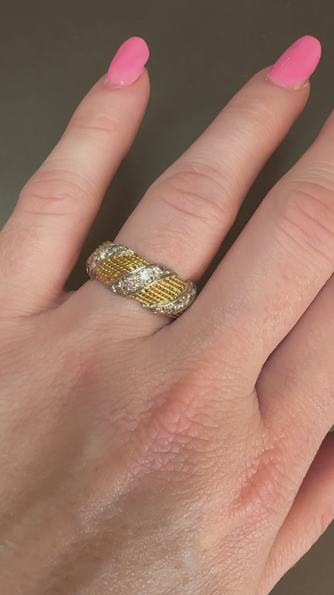 This ultra chic band was made in the Mid-Century era circa 1960's. Designed with a rope texture in heavy 18k with diagonal striped bands set with diamonds. This ring measures as a size 7 but fits more like a 6.5 due to the width. It is truly gorgeous and would make a killer wedding or anniversary band!