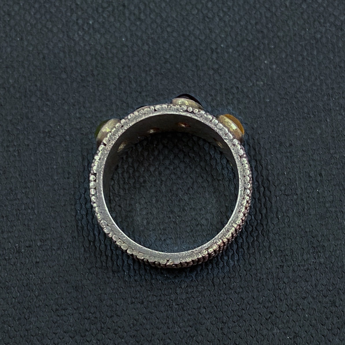 This band is so cool and it looks just stunning on, a total conversation piece. Made in the 1990’s, this band has colorful bezel set peridot, amethyst, garnet and citrine cabochons. The band is made of sterling silver with applied granulation which is an ancient technique that is quite difficult to perform.