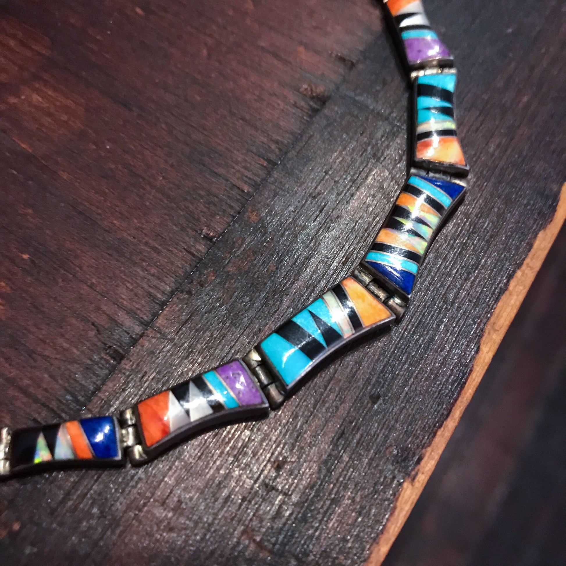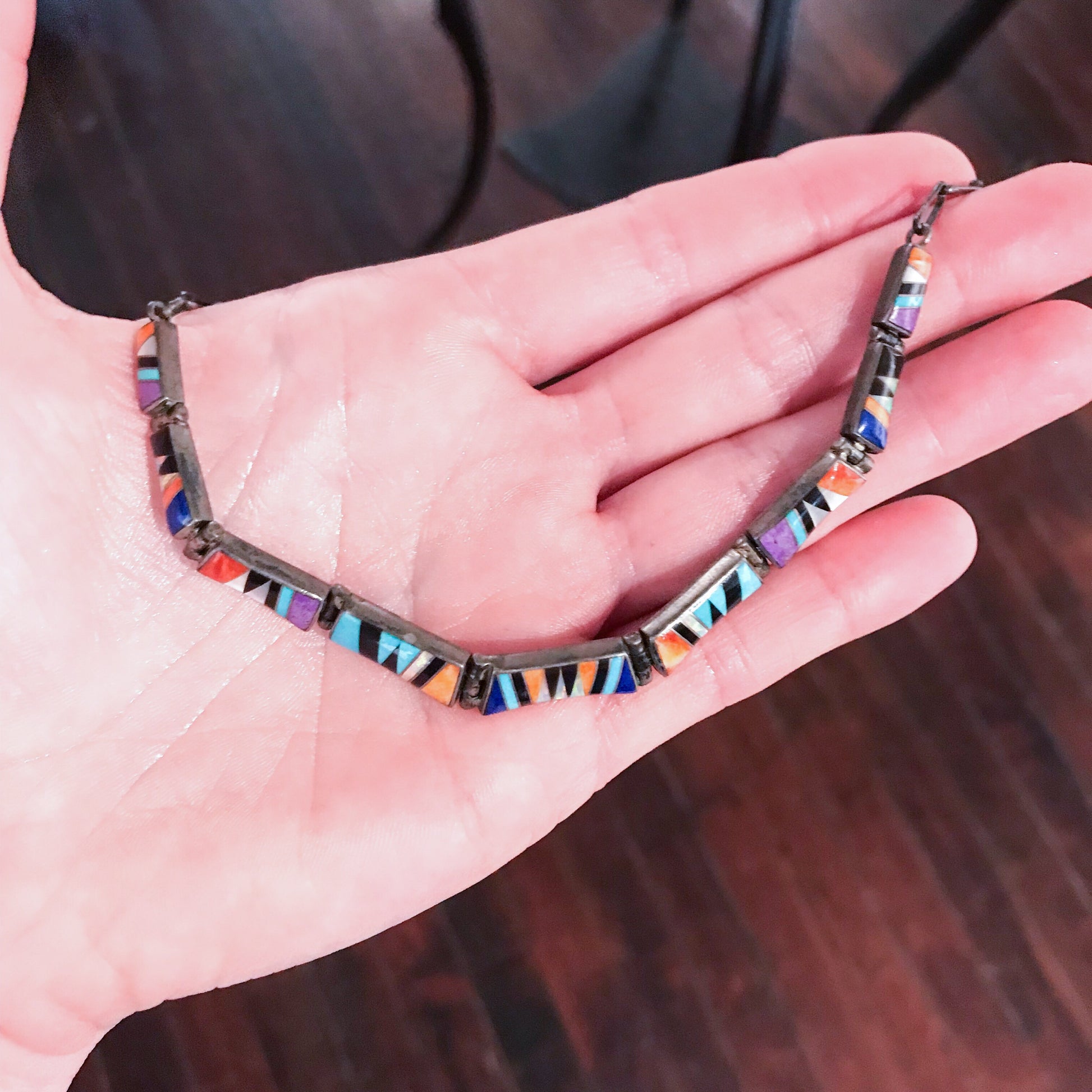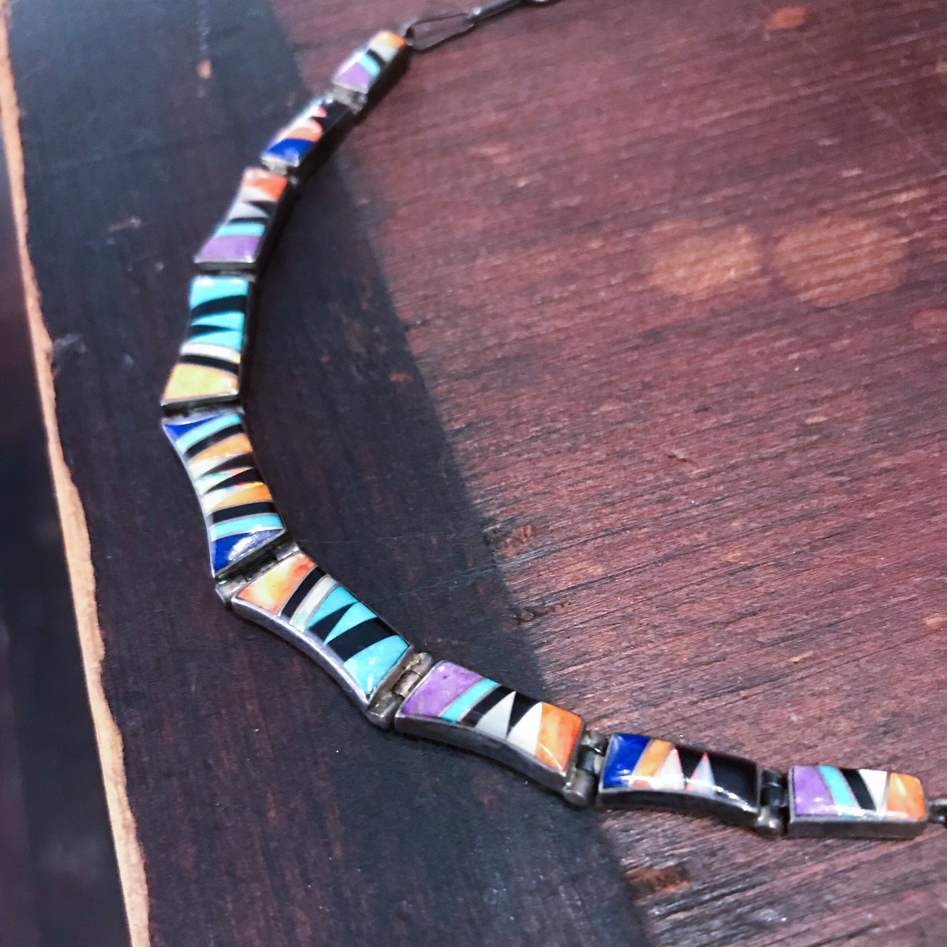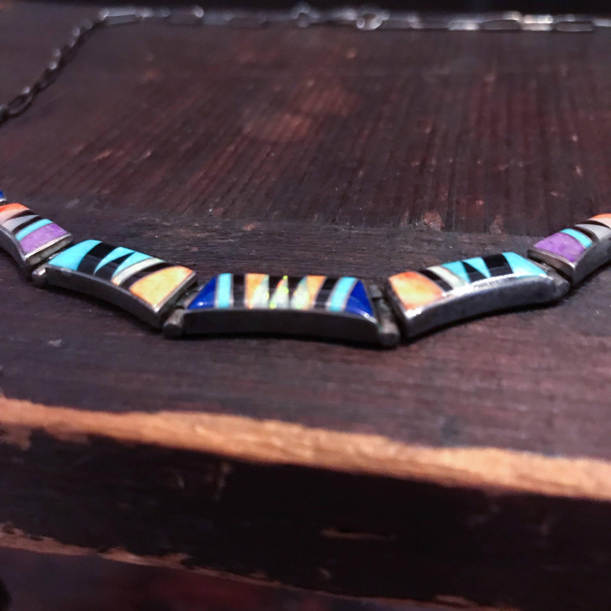 SOLD--Vintage Navajo Inlay Necklace Sterling c. 1980