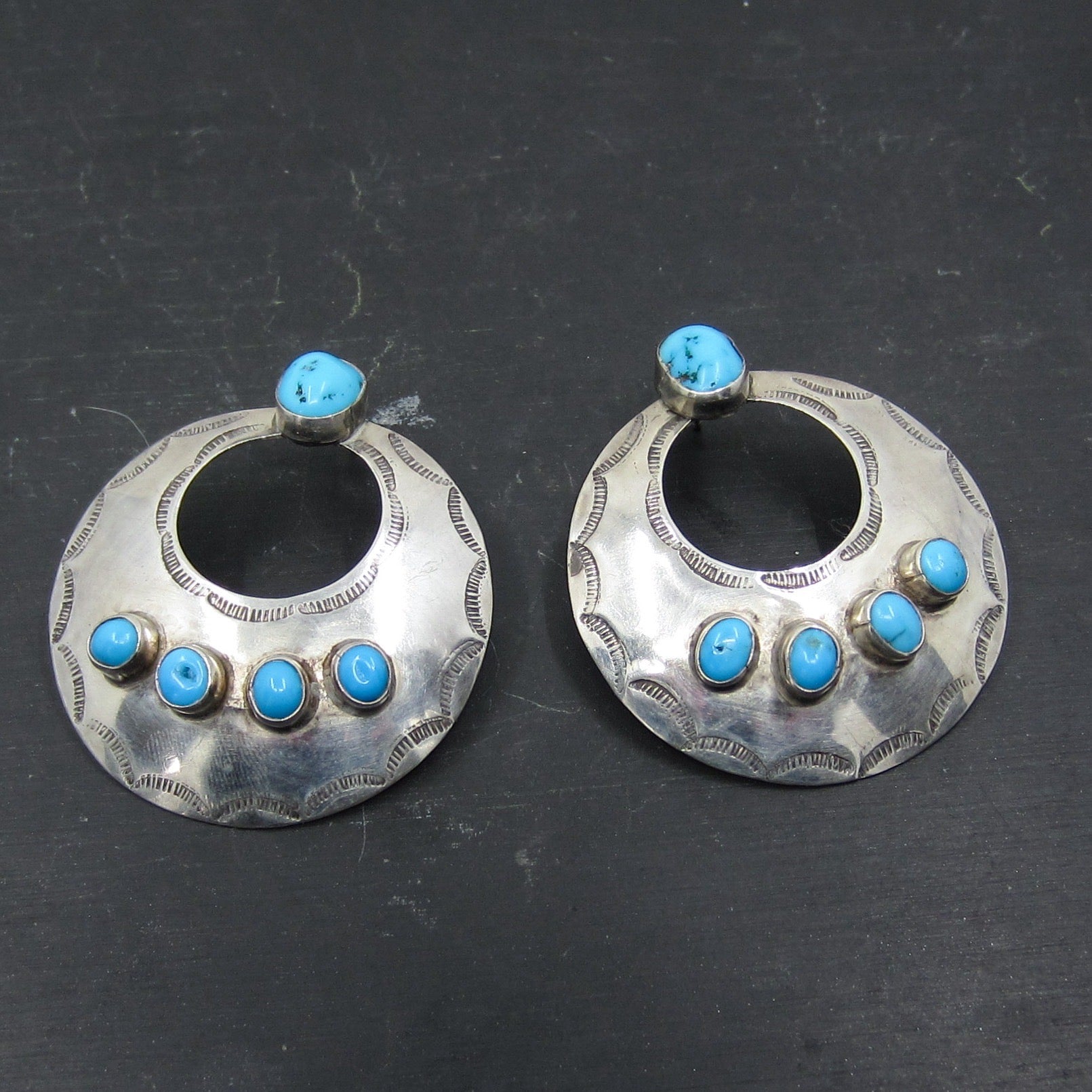 A beautiful and large pair of Navajo front facing turquoise hoop earrings in Sterling silver circa 1970s.