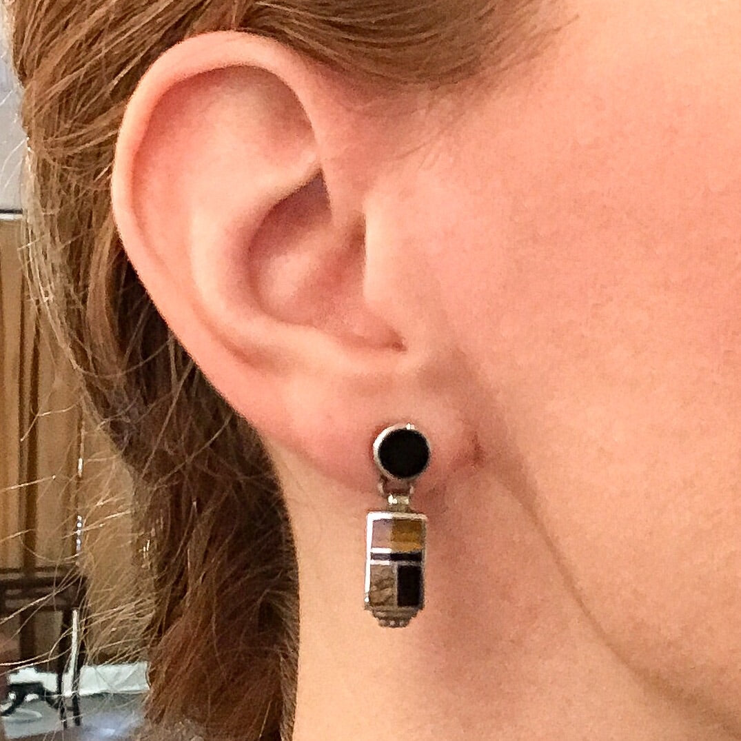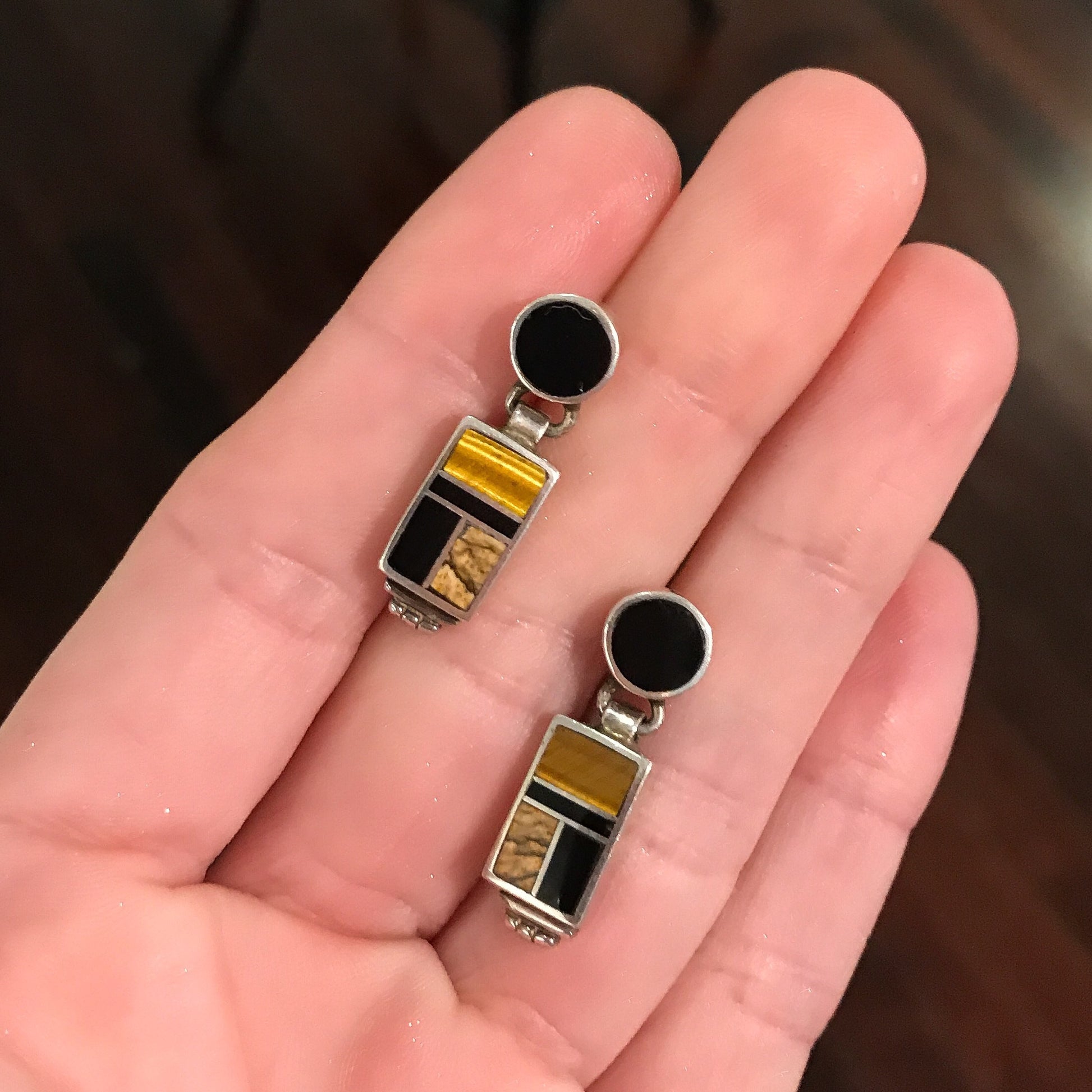 These great earrings are super chic, super wearable and dramatic without being overpowering. Made in the late 1990's, they feature inlaid onyx and tiger's eye in a Memphis-y geometric pattern. Not too big at 1" length and lightweight, these can become your go-to fall season earring!
