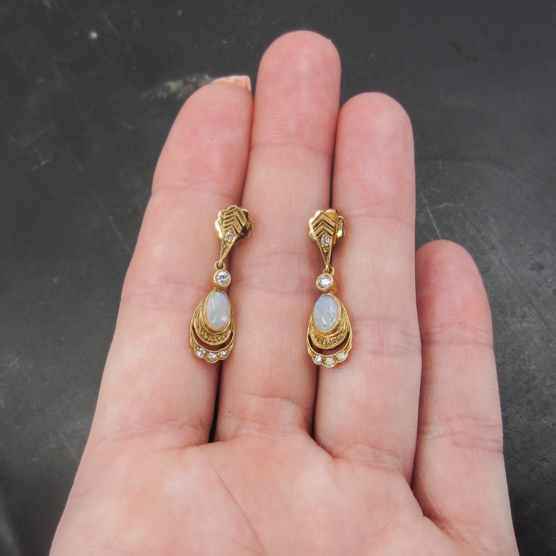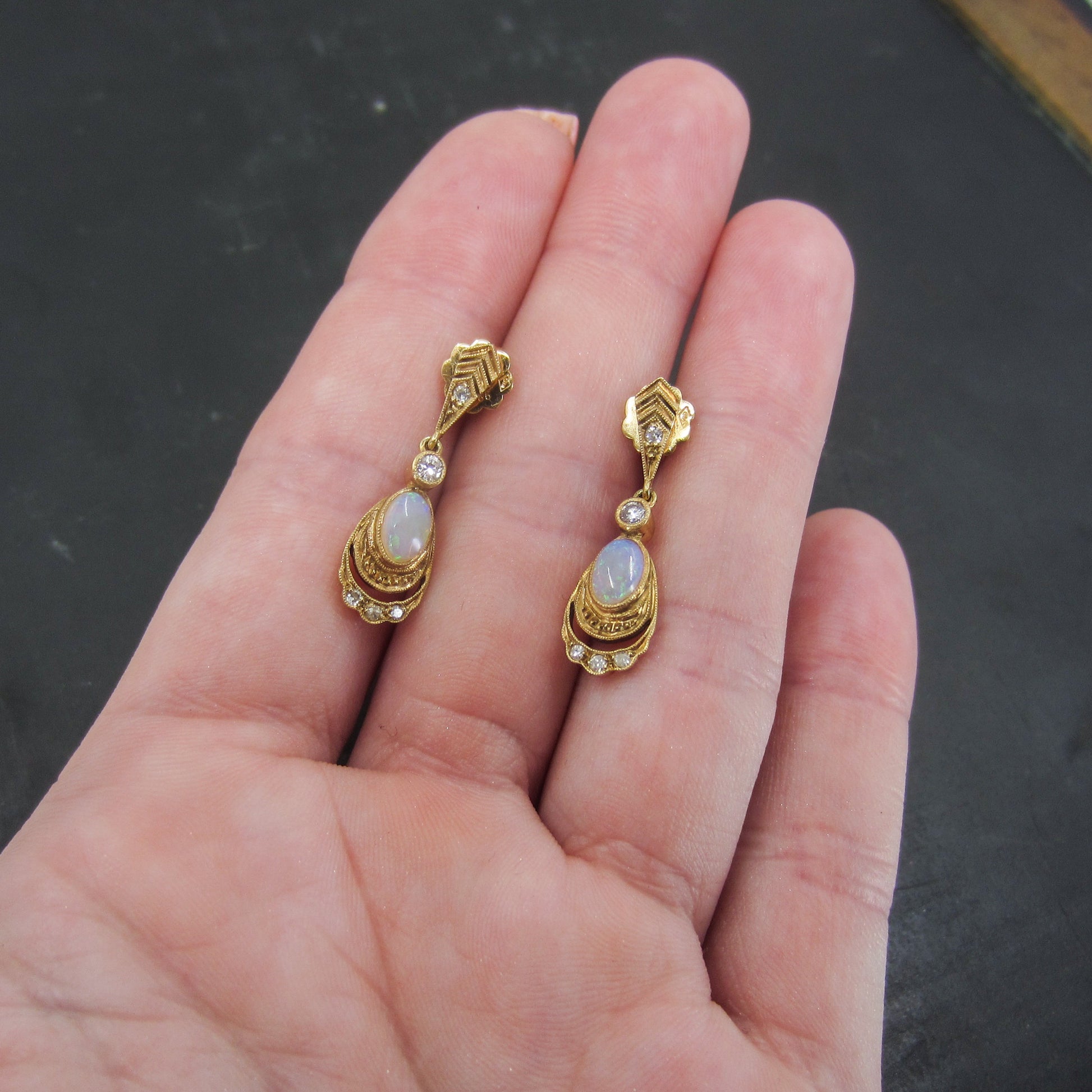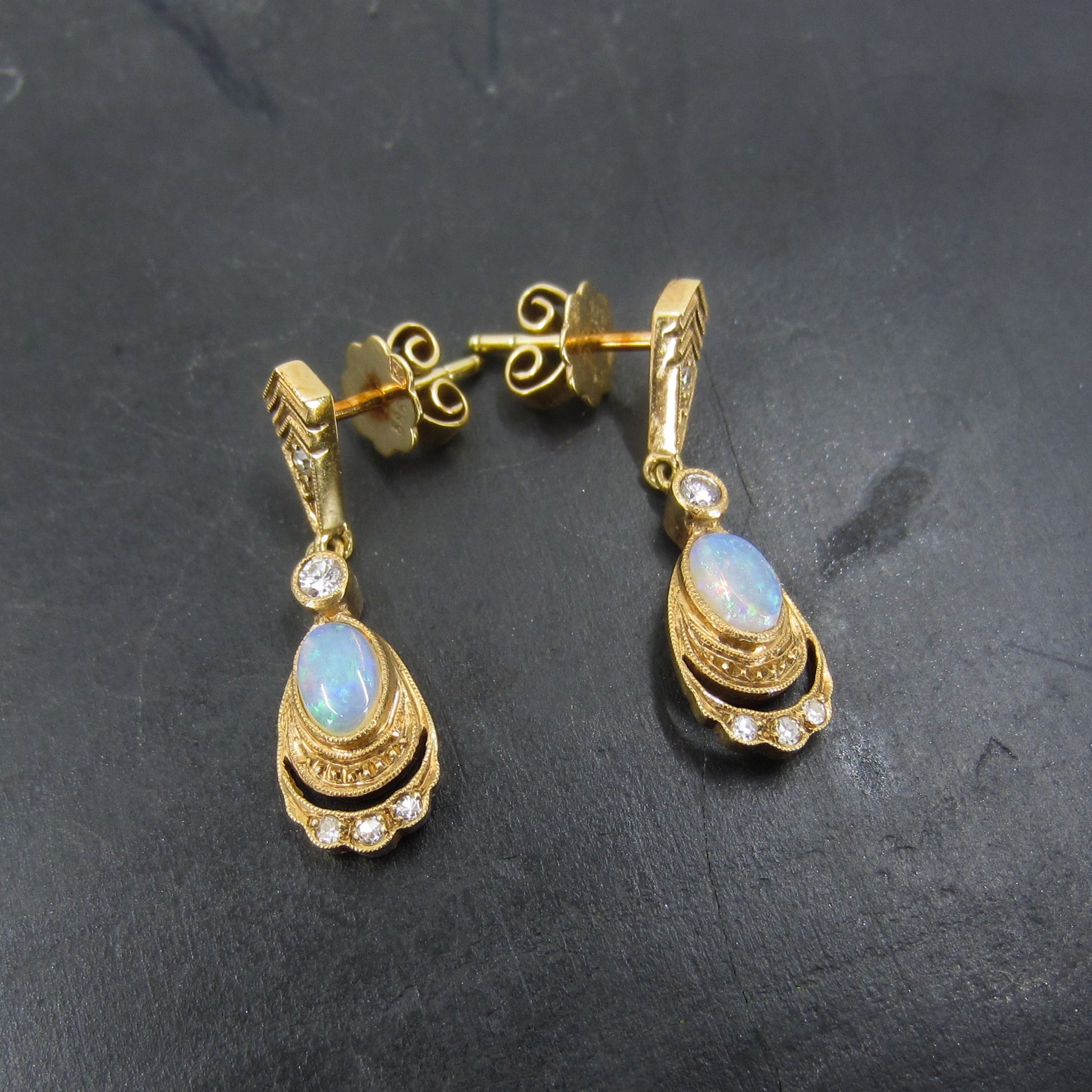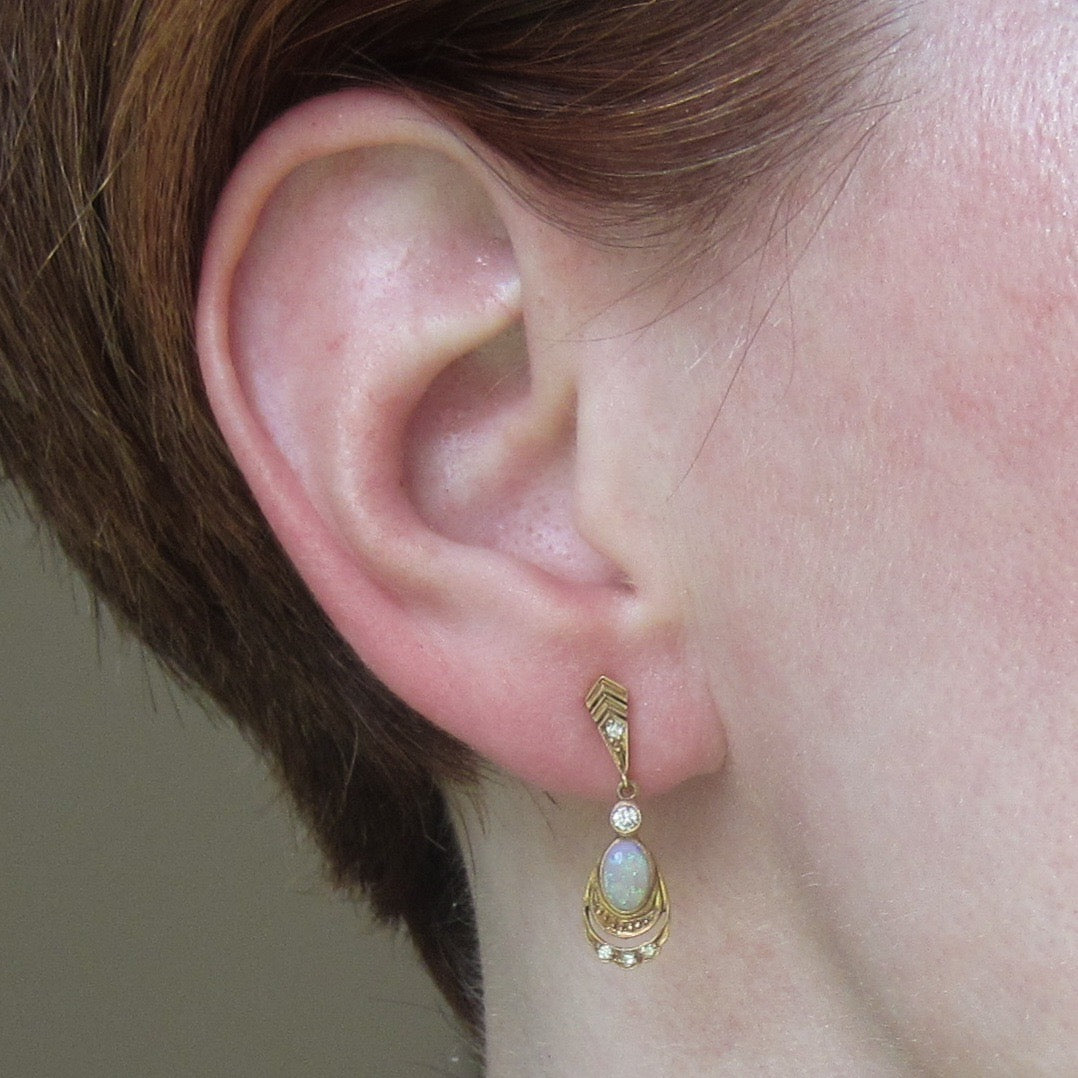 SOLD-Vintage Opal and Diamond Drop Earrings 14k