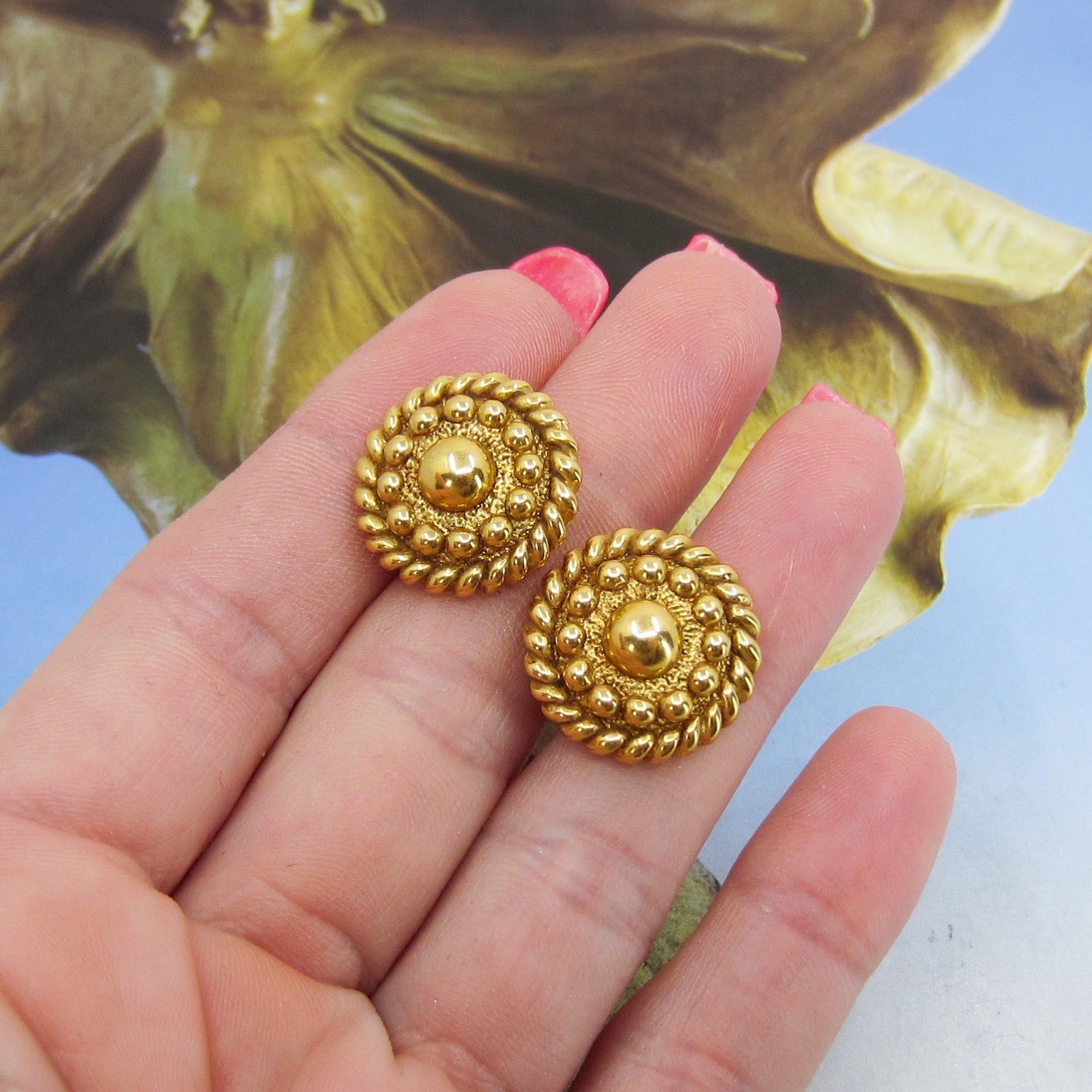 A pair of power earrings from the 1980's made in 18k rich yellow gold, with a raised Etruscan pattern. Lightweight to wear but bold in look!