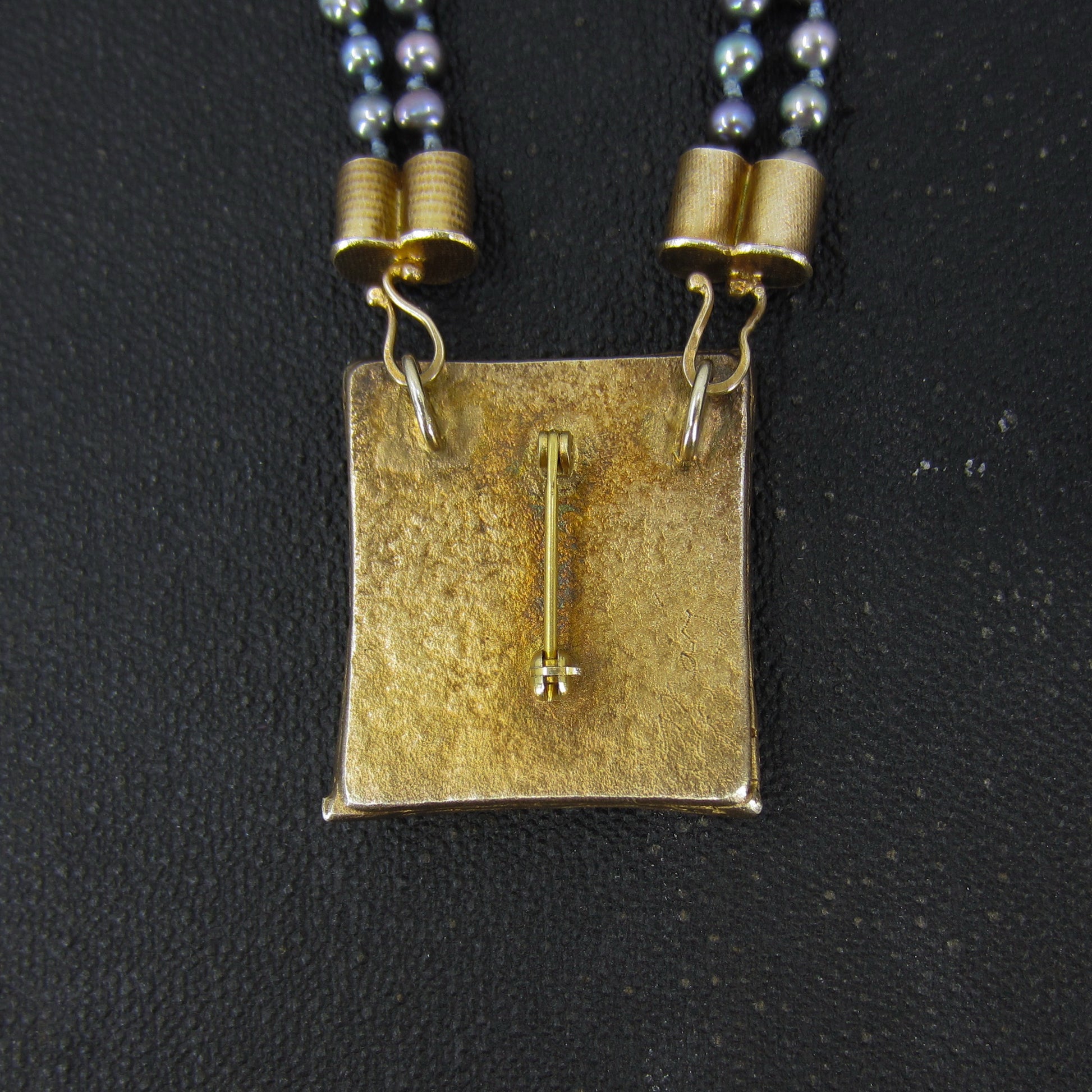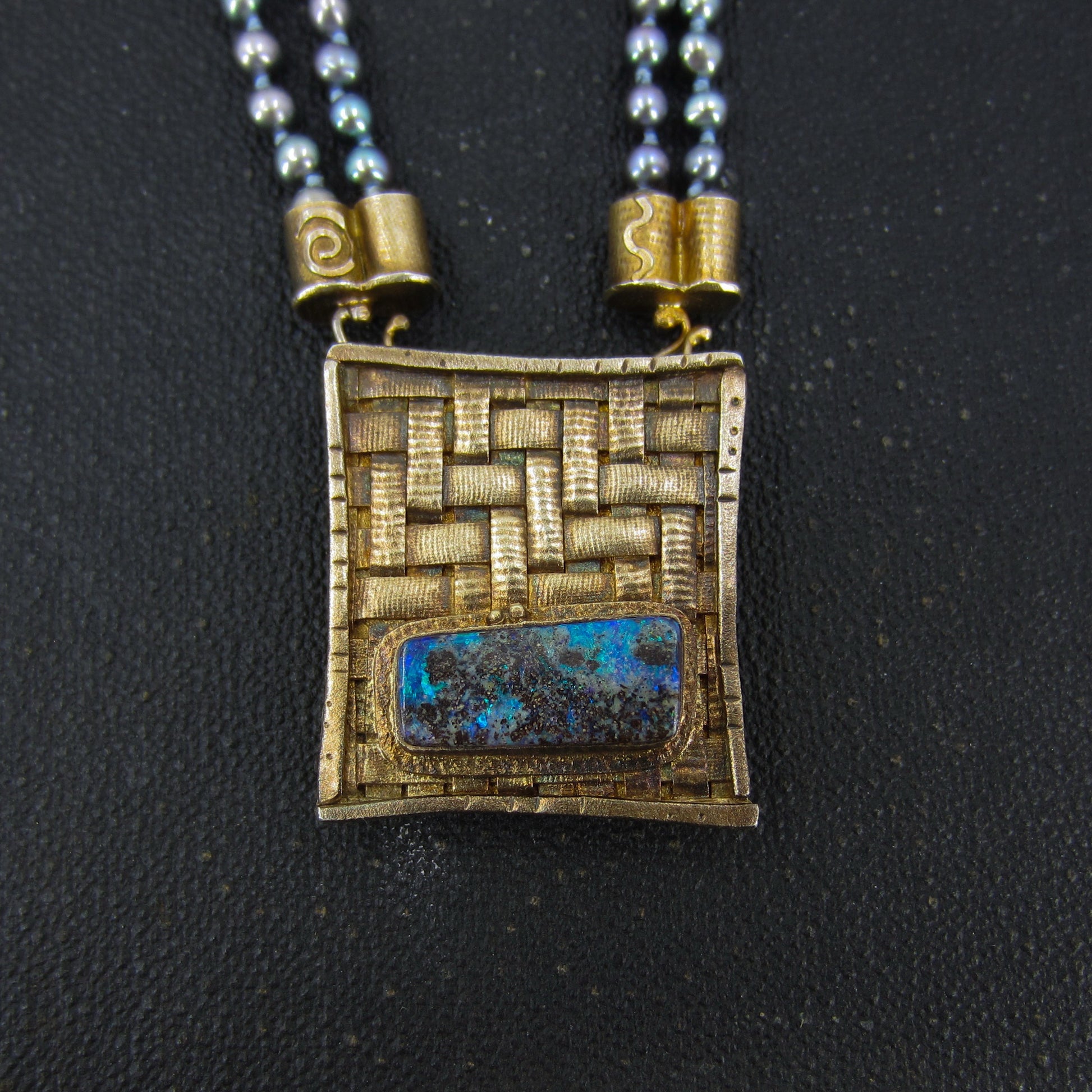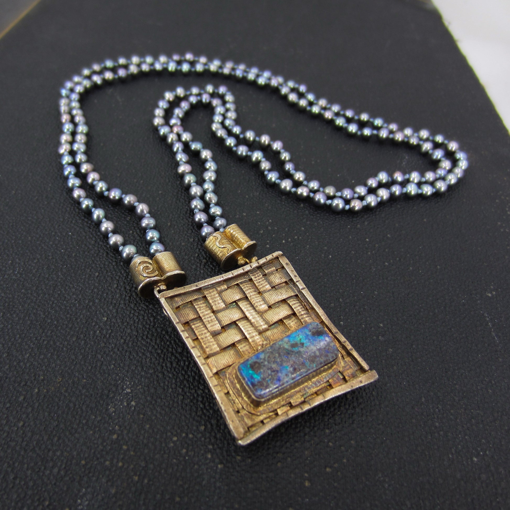 This artisan made necklace from the late 1990's is really beautiful in person! Made in gilt silver with lustrous grey hand-knotted cultured pearls and a central pin/pendant with a woven motif and a colorful boulder opal. The pendant can be removed from the pearls and worn as a brooch as an added bonus! This piece has a gorgeous palette, the materials are all high quality and it is subtle and elegant when worn. Signed with illegible signature and "98".