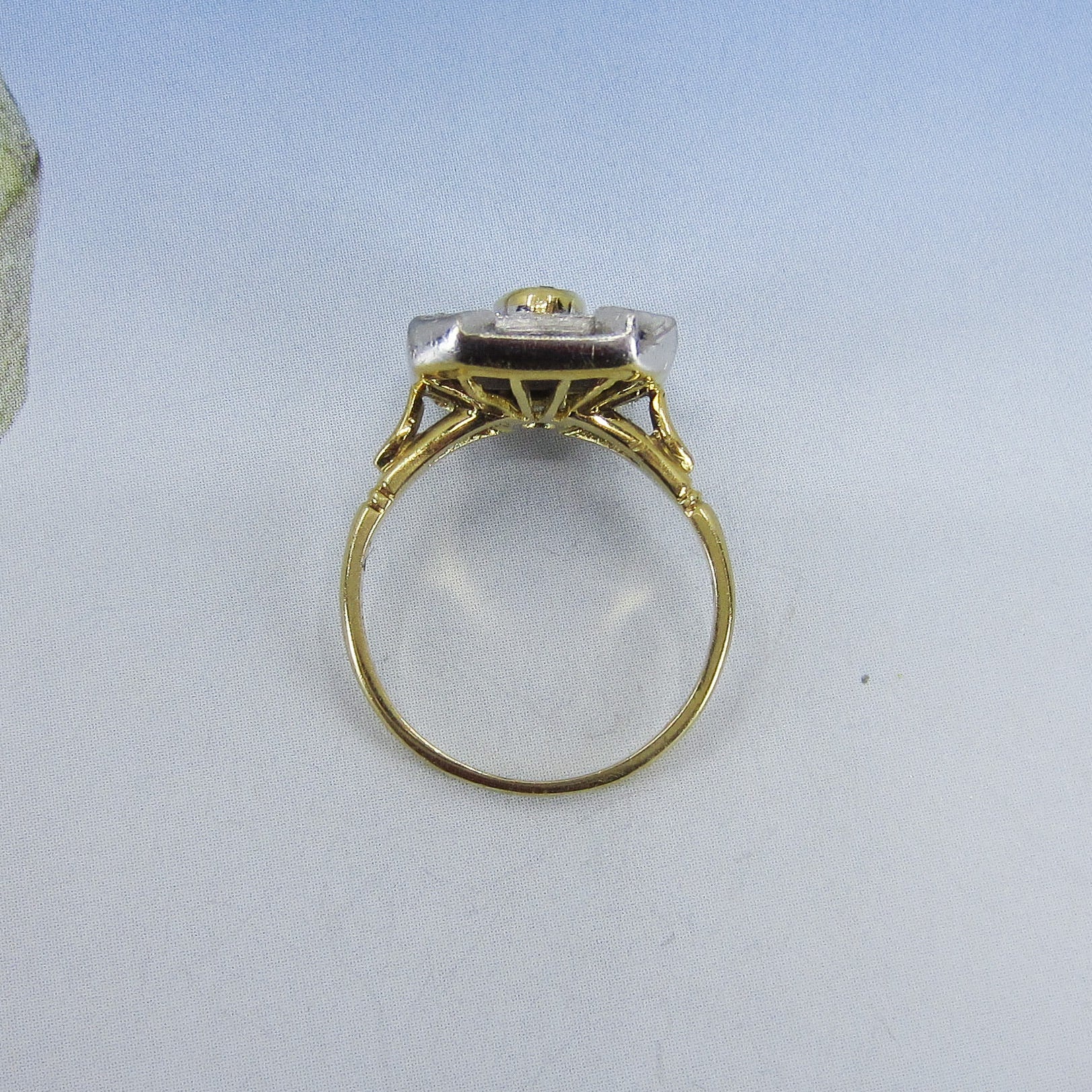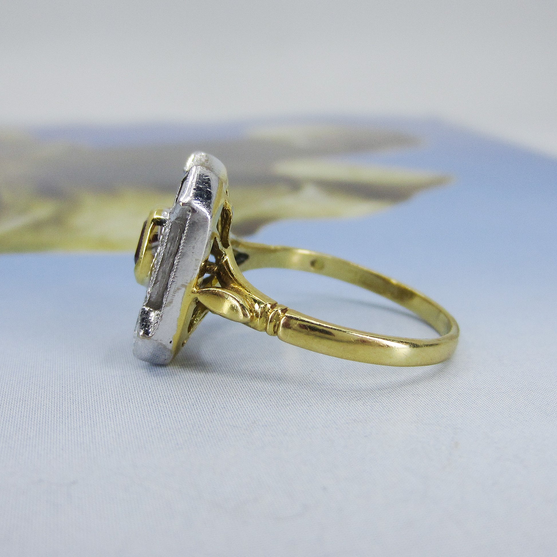 This is a GREAT vintage ring from the late 80's, made in Birmingham England in 18k white and yellow gold with a beautifully colored central oval cut ruby surrounded by round and baguette diamonds. The more I see this ring the more I'm loving it--it's really well-made with high quality stones and a millegrain detail around the bezel. The geometry of the ring is especially pleasing, particularly when its in motion as you get a overall sparkle from the round cut diamonds and then big flashes from the corner baguettes! It's just COOL. This ring has all the stylish trappings and design of the late 80's to early 90's fashion and is substantial enough to be glamorous but not so huge you can't wear it every day. In fact, it would make an excellent alternative engagement ring for a ruby lover!