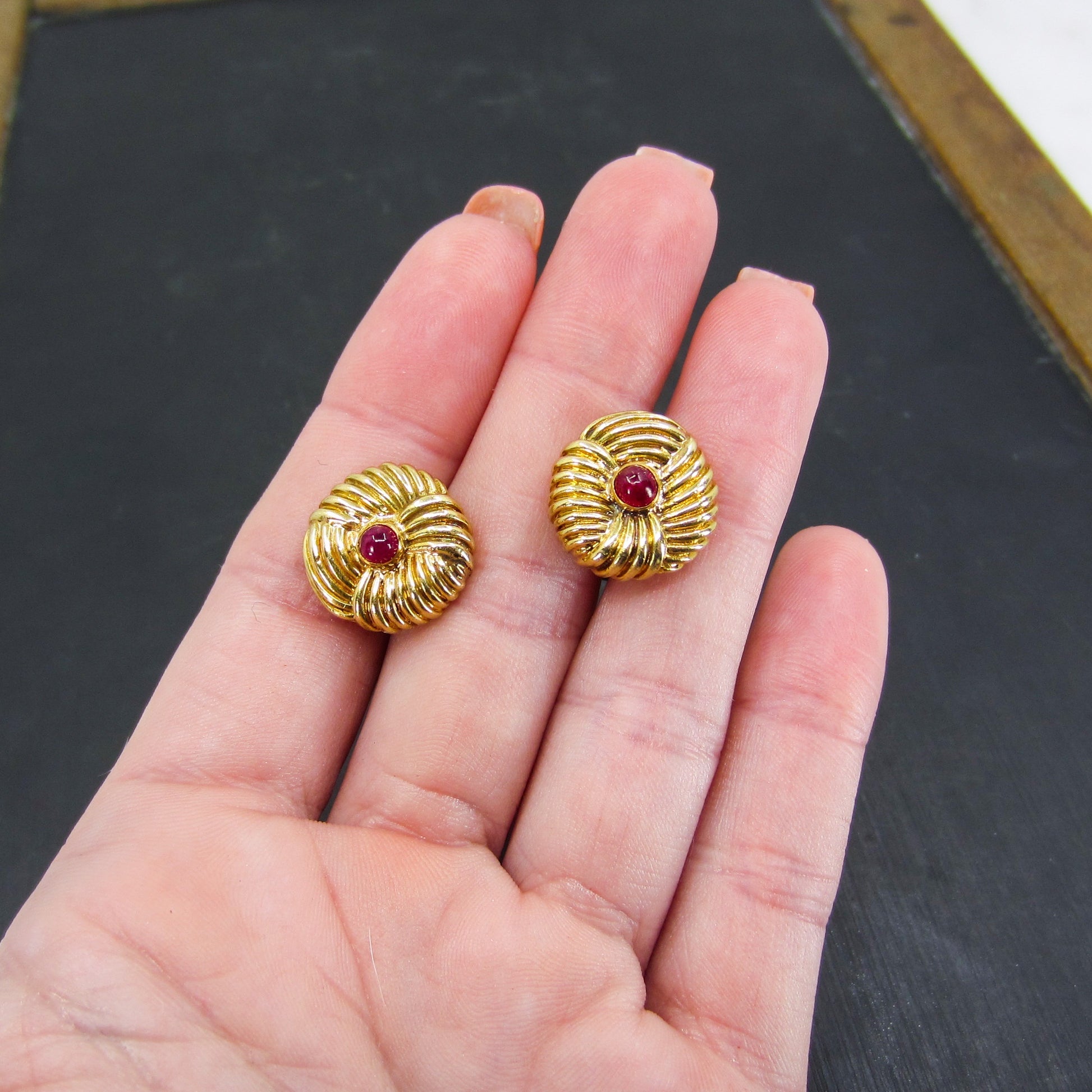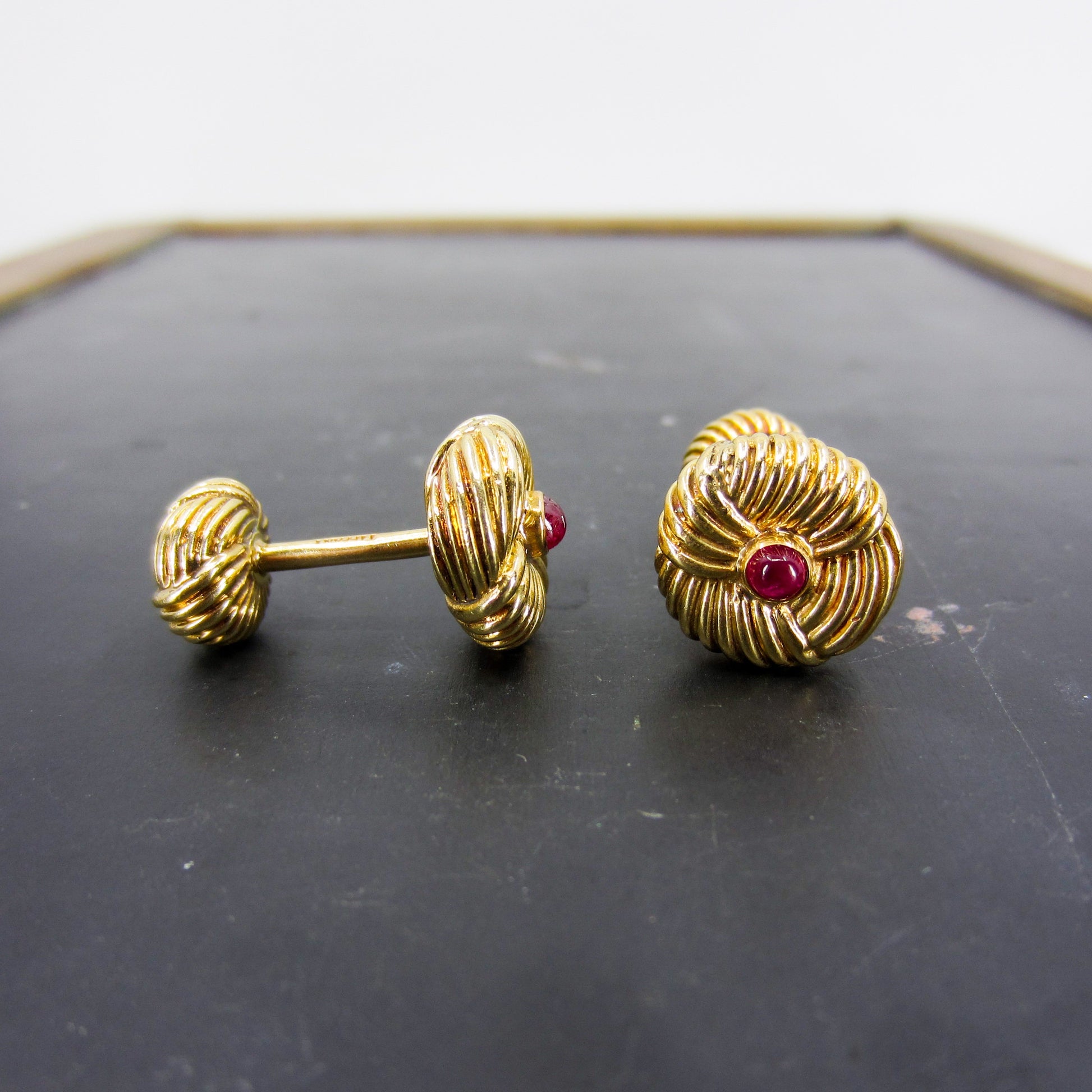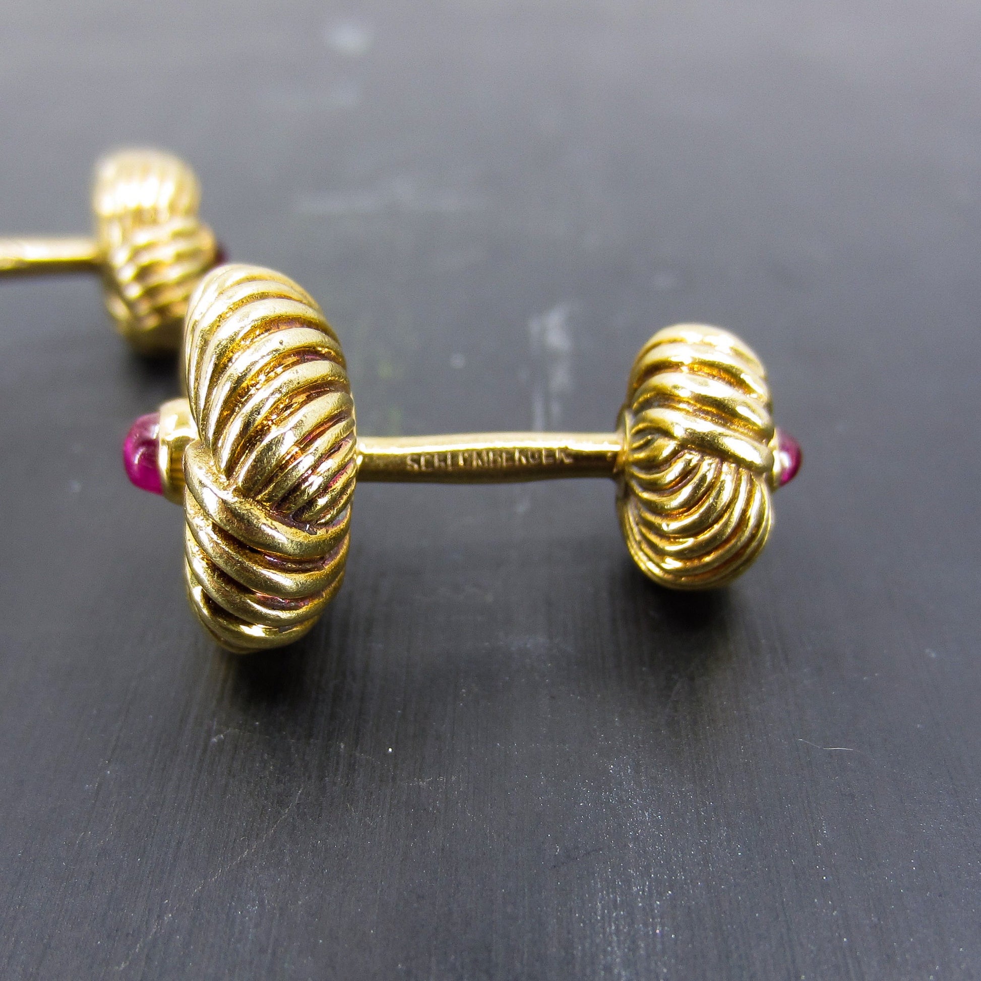 A gorgeous pair of vintage cufflinks made by Jean Schlumberger for Tiffany & Co., set with four natural cabochon rubies and made in 18k yellow gold. Circa 1960.