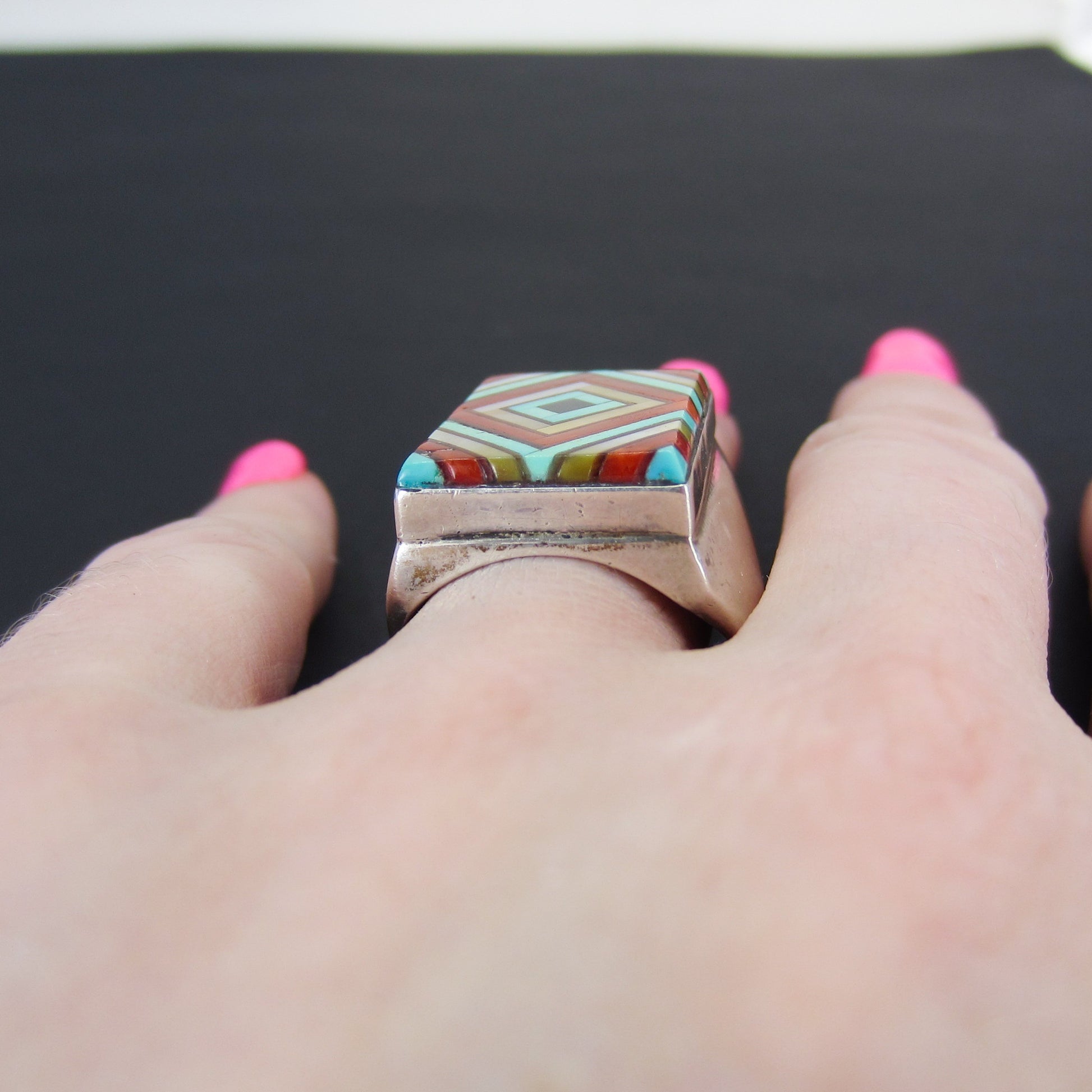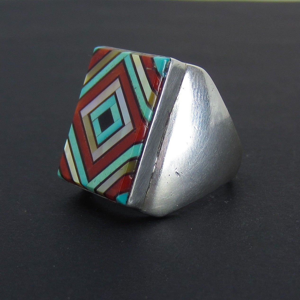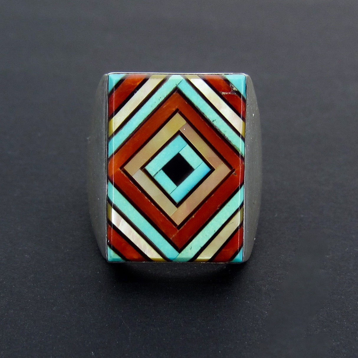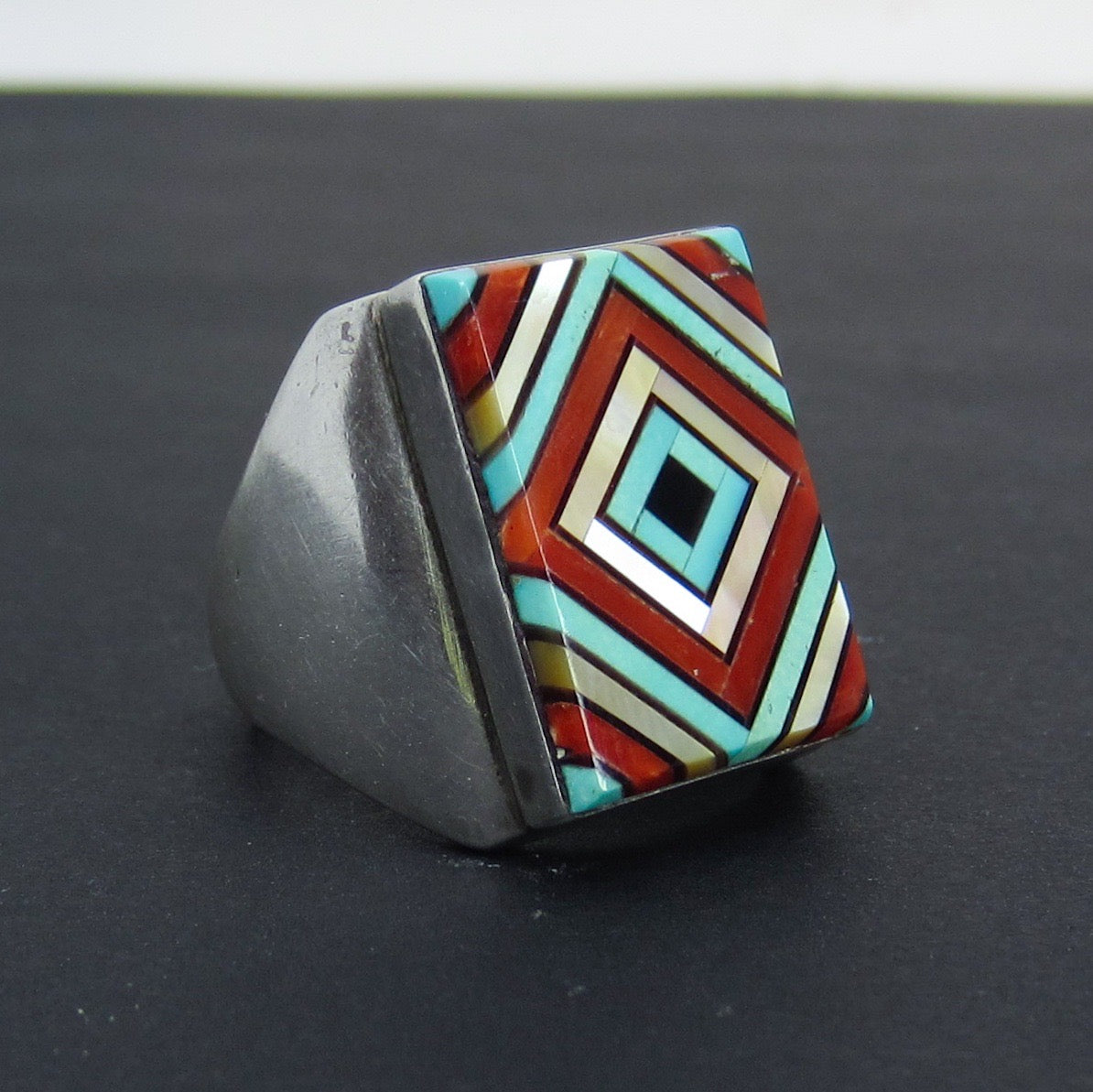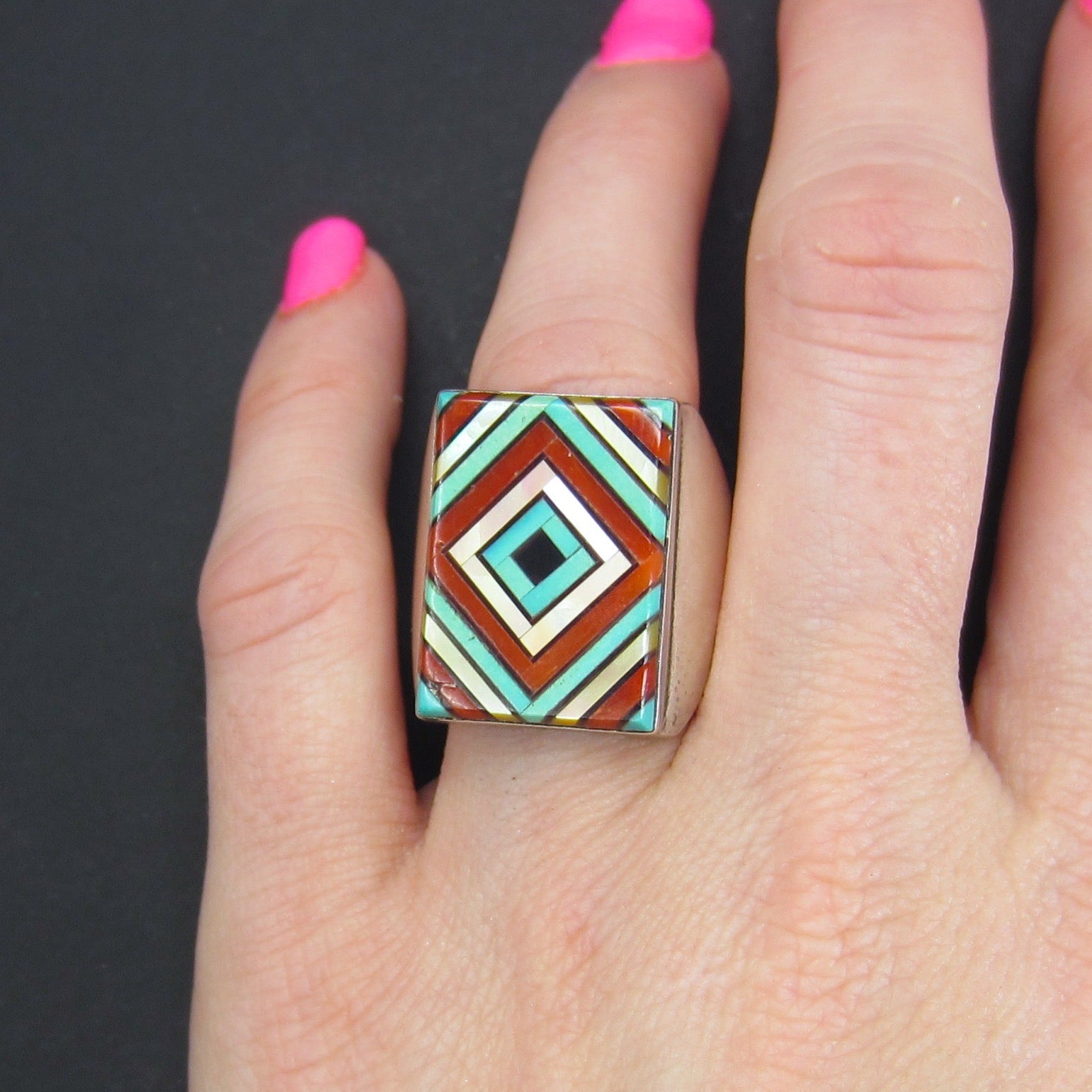 This fantastic ring is meticulosly set with inlaid turquoise, mother of pearl, onyx and spiny oyster in a concentric squares pattern. Made in sterling silver, circa 1980--a statement ring!