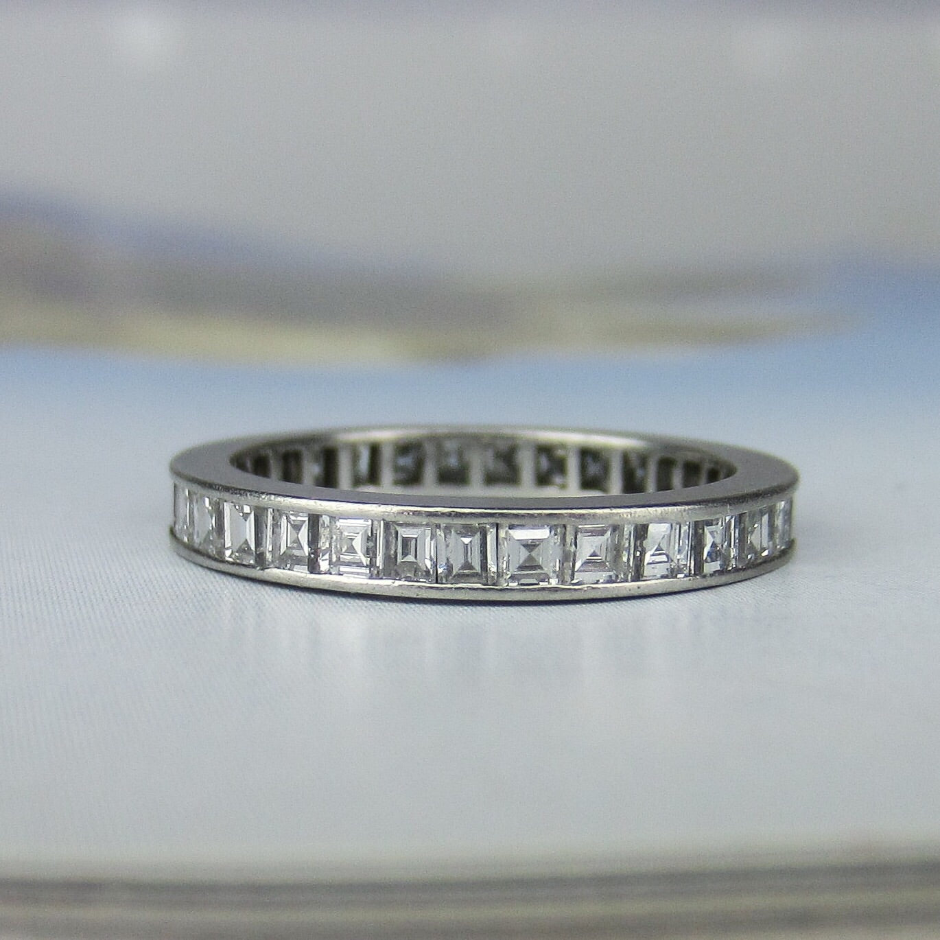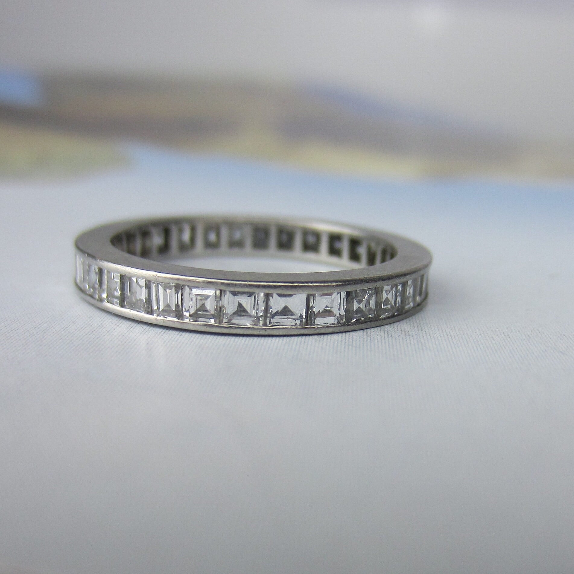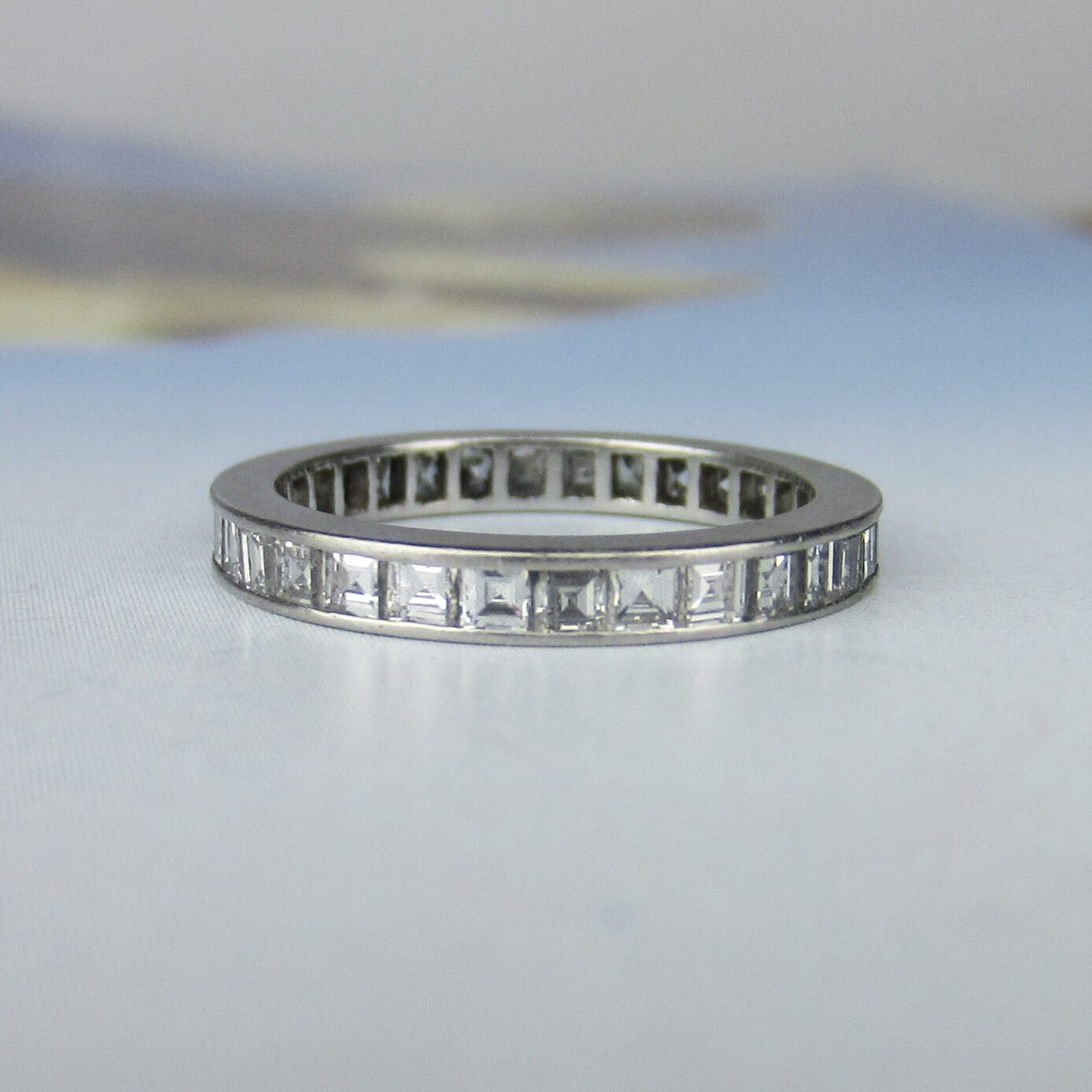 SOLD-Square Carre Cut Diamond Eternity Band Platinum, Size 6 c. 1940