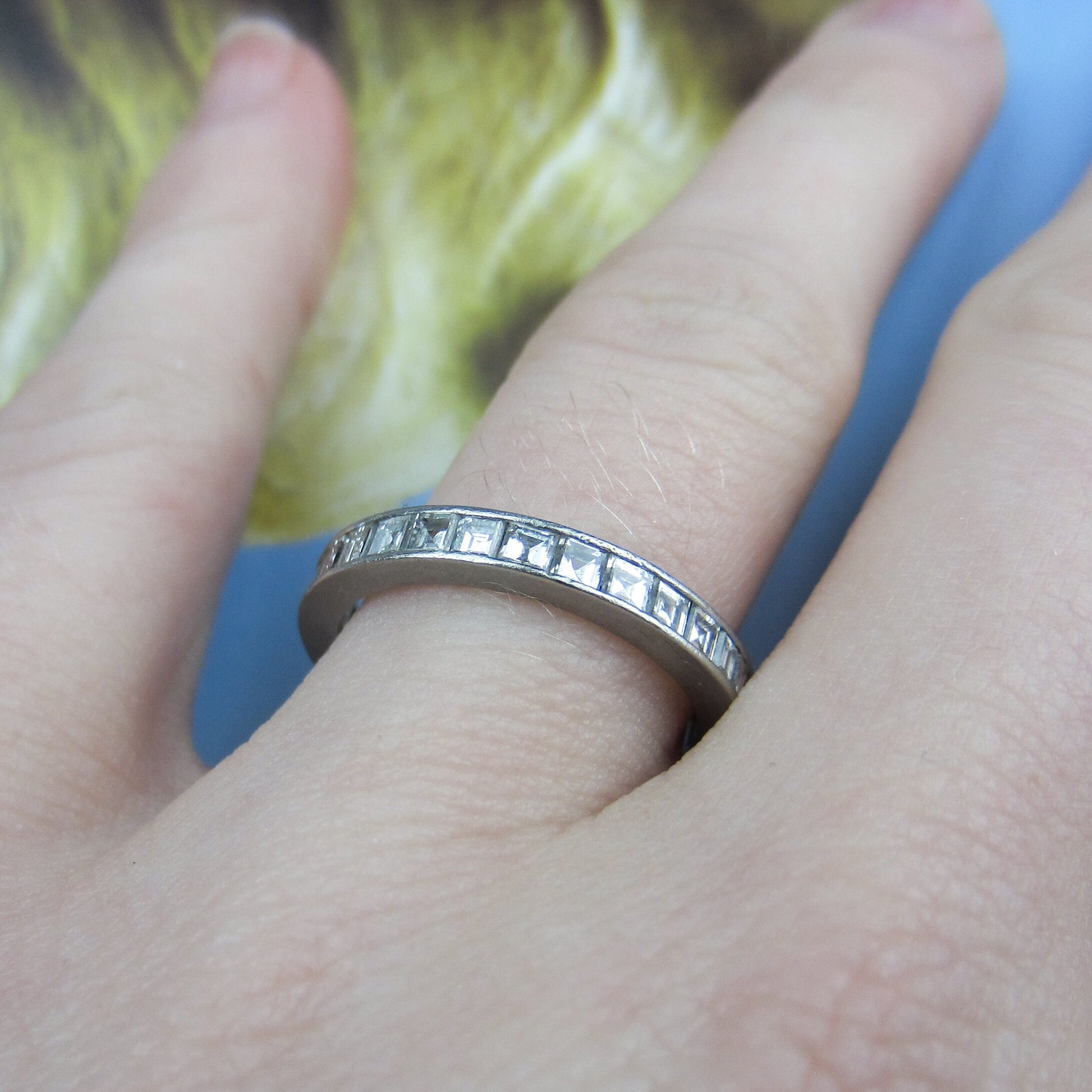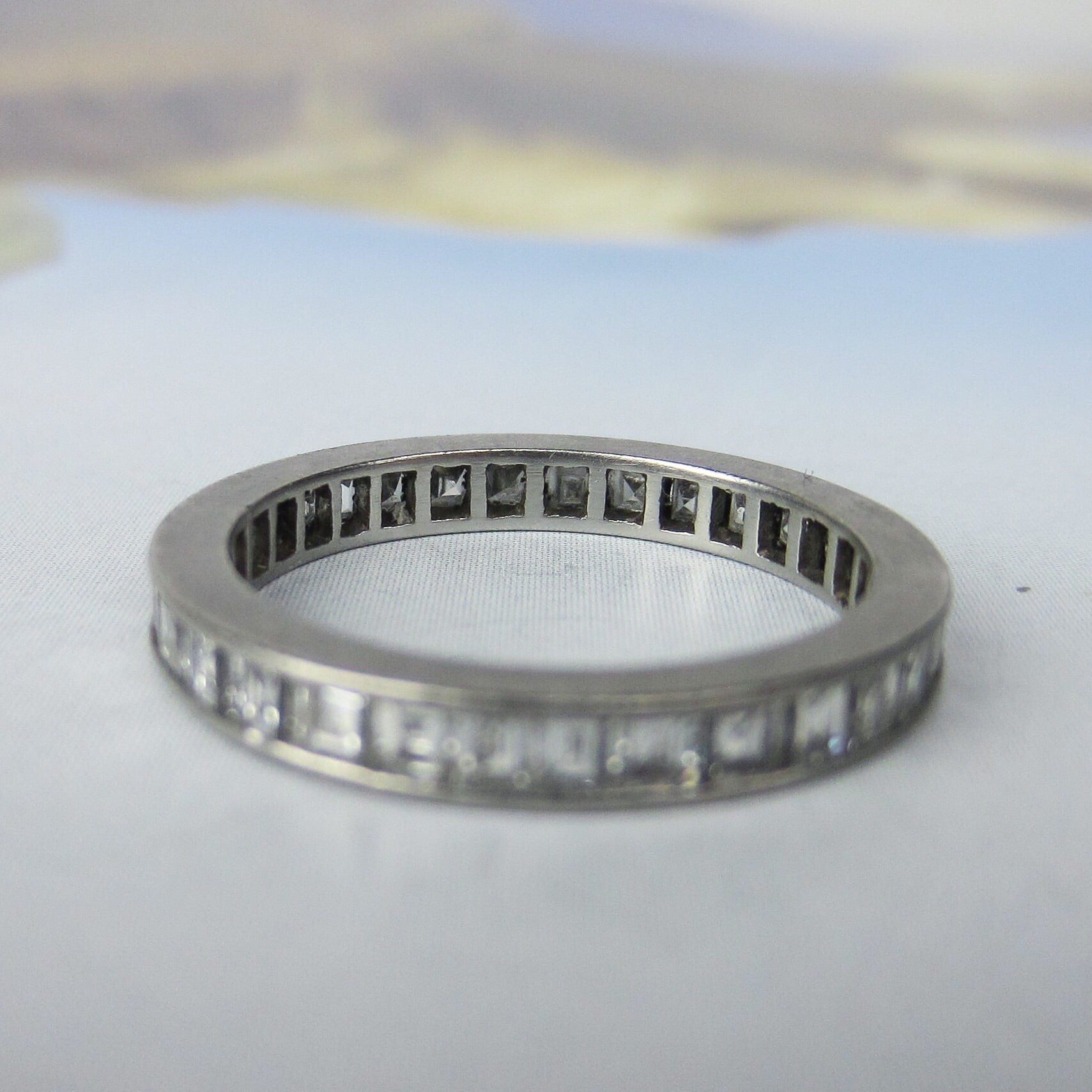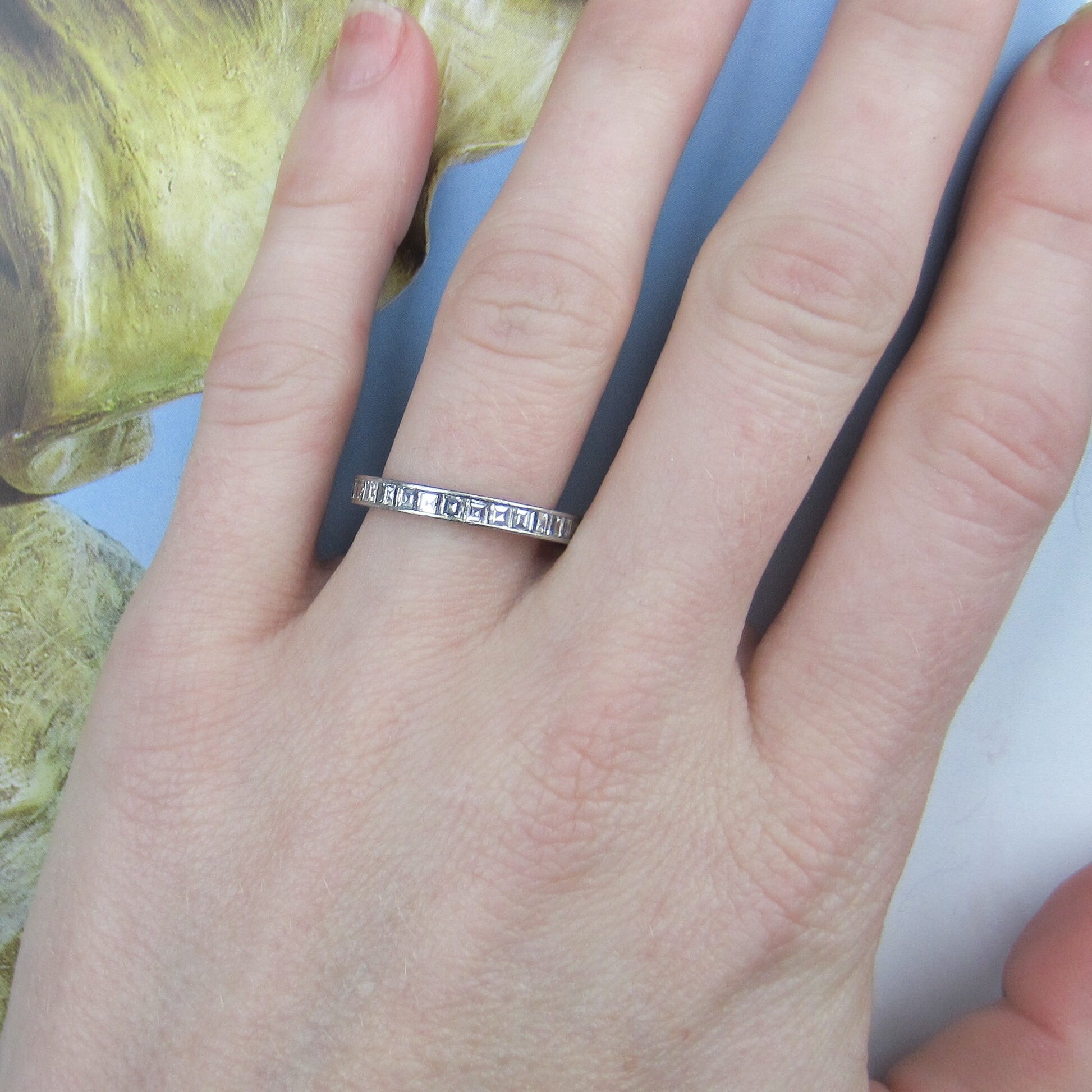 SOLD-Square Carre Cut Diamond Eternity Band Platinum, Size 6 c. 1940