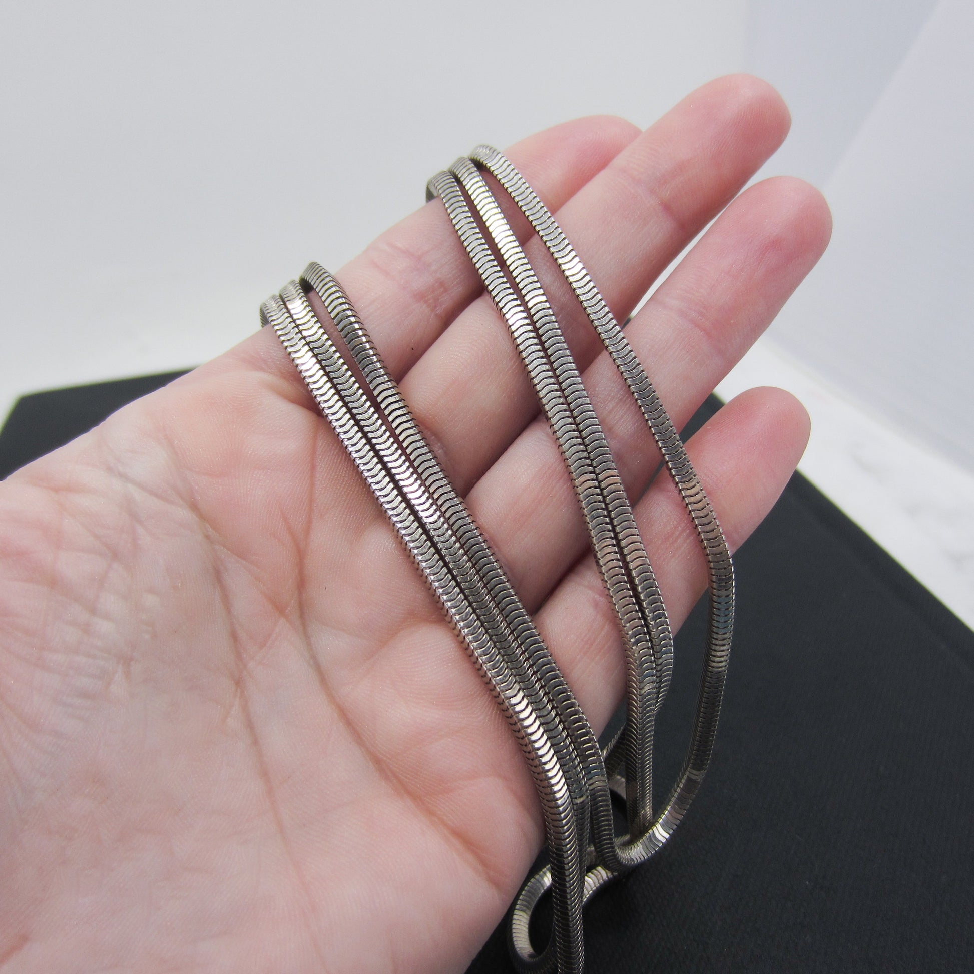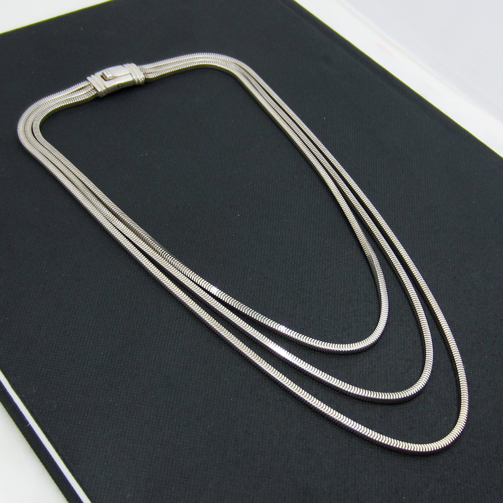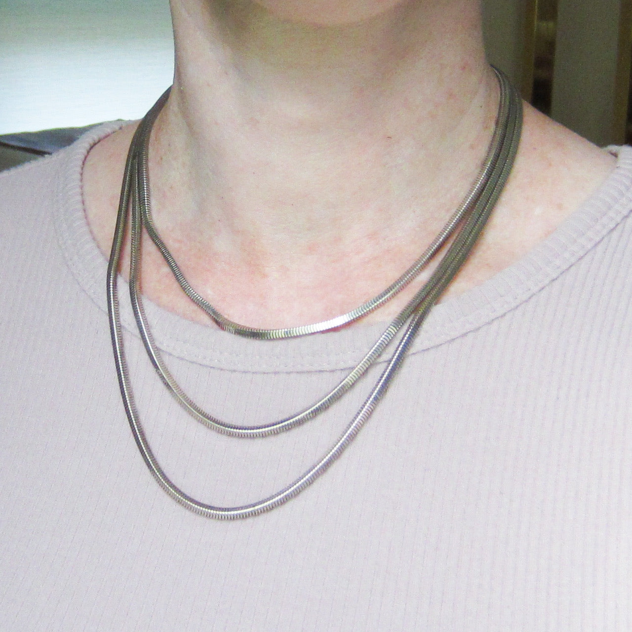 Here's your next every day statement necklace! This three strand chain, made in sterling silver circa 1970's, features three thick, slinky squared snake chains in graduated lengths. It looks FANTASTIC on! Made in Scotland.