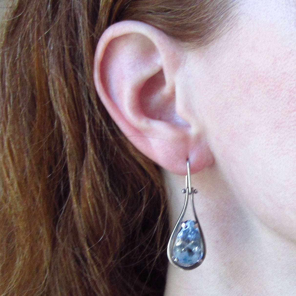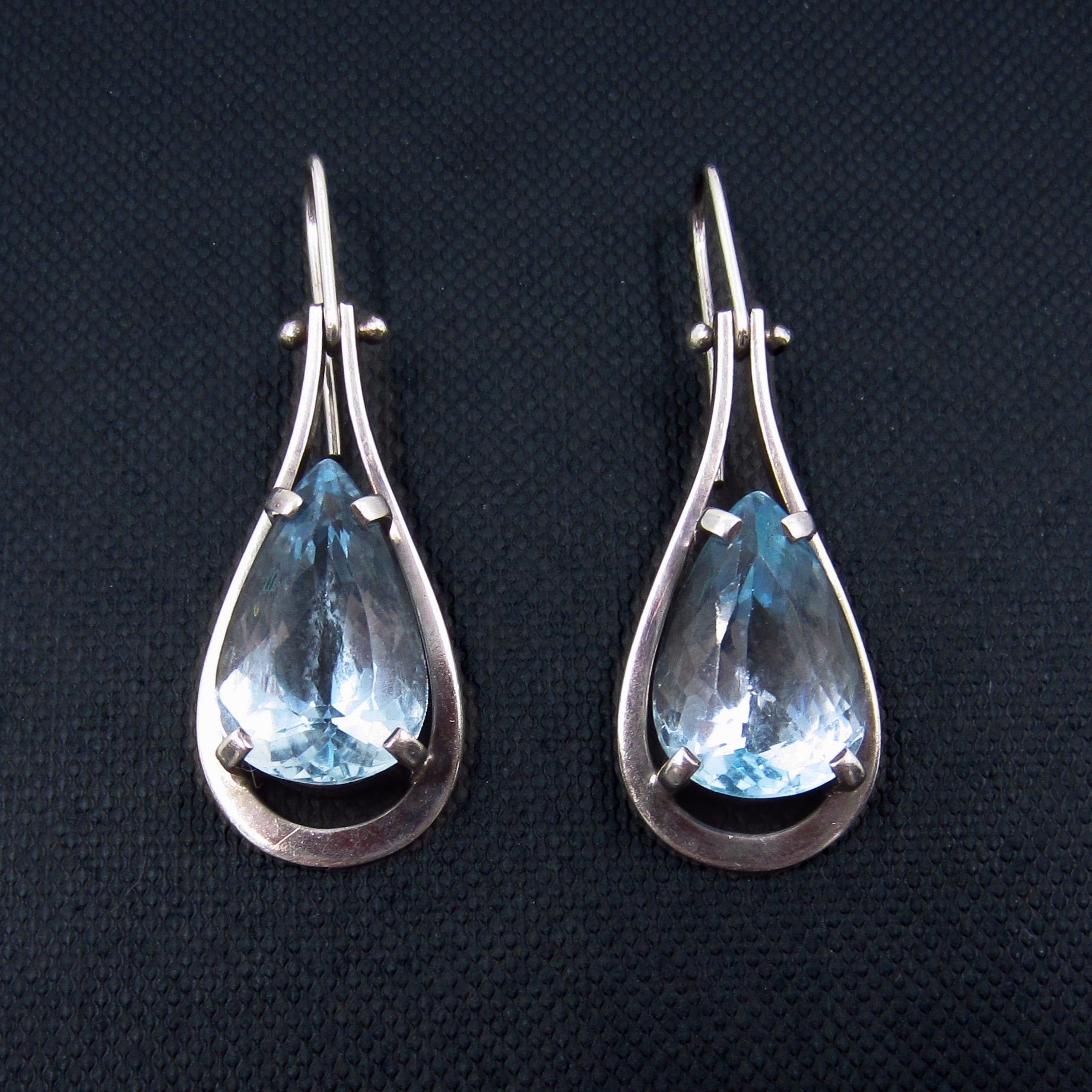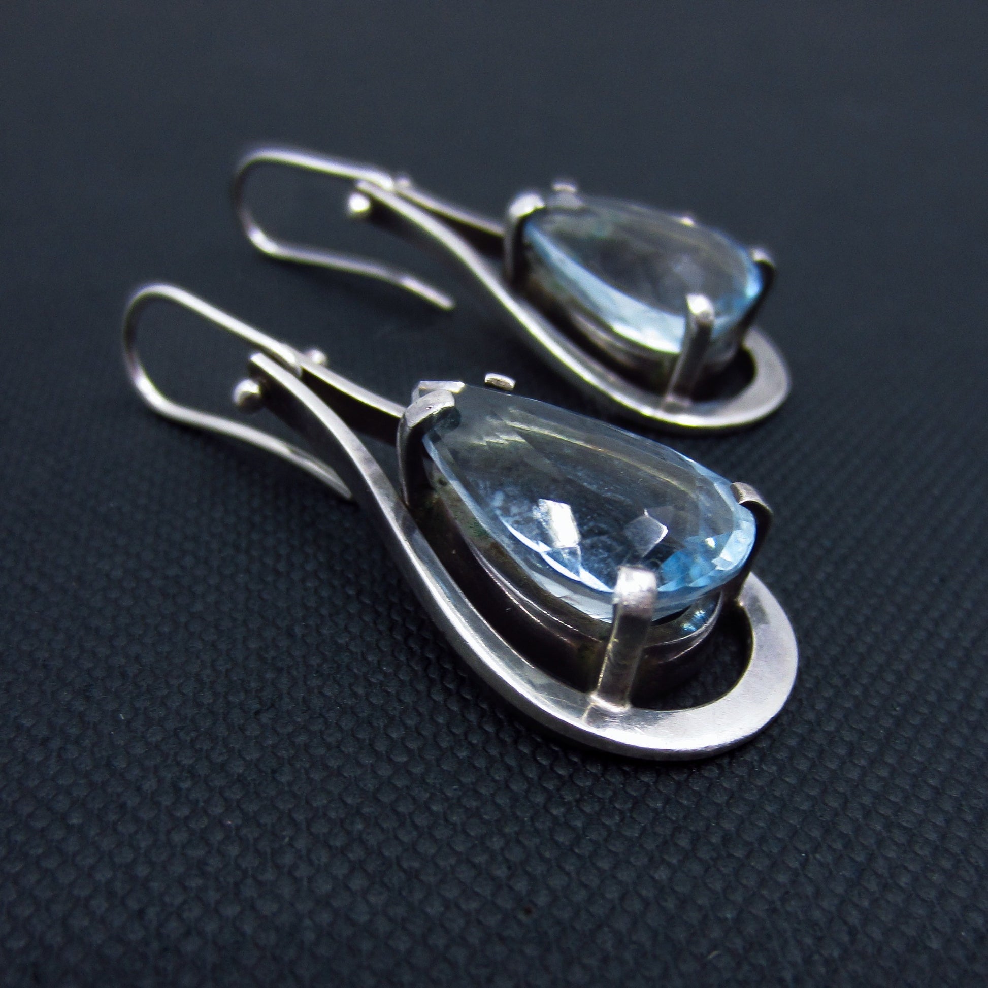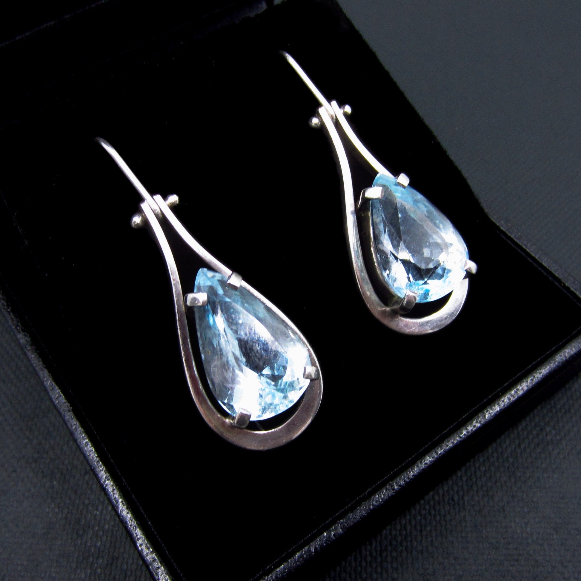 An absolutely beautiful pair of drop earrings, featuring a pear cut blue topaz set in a geometric sterling silver frame. Made cIrca 1990 with matching topaz collar available separately.