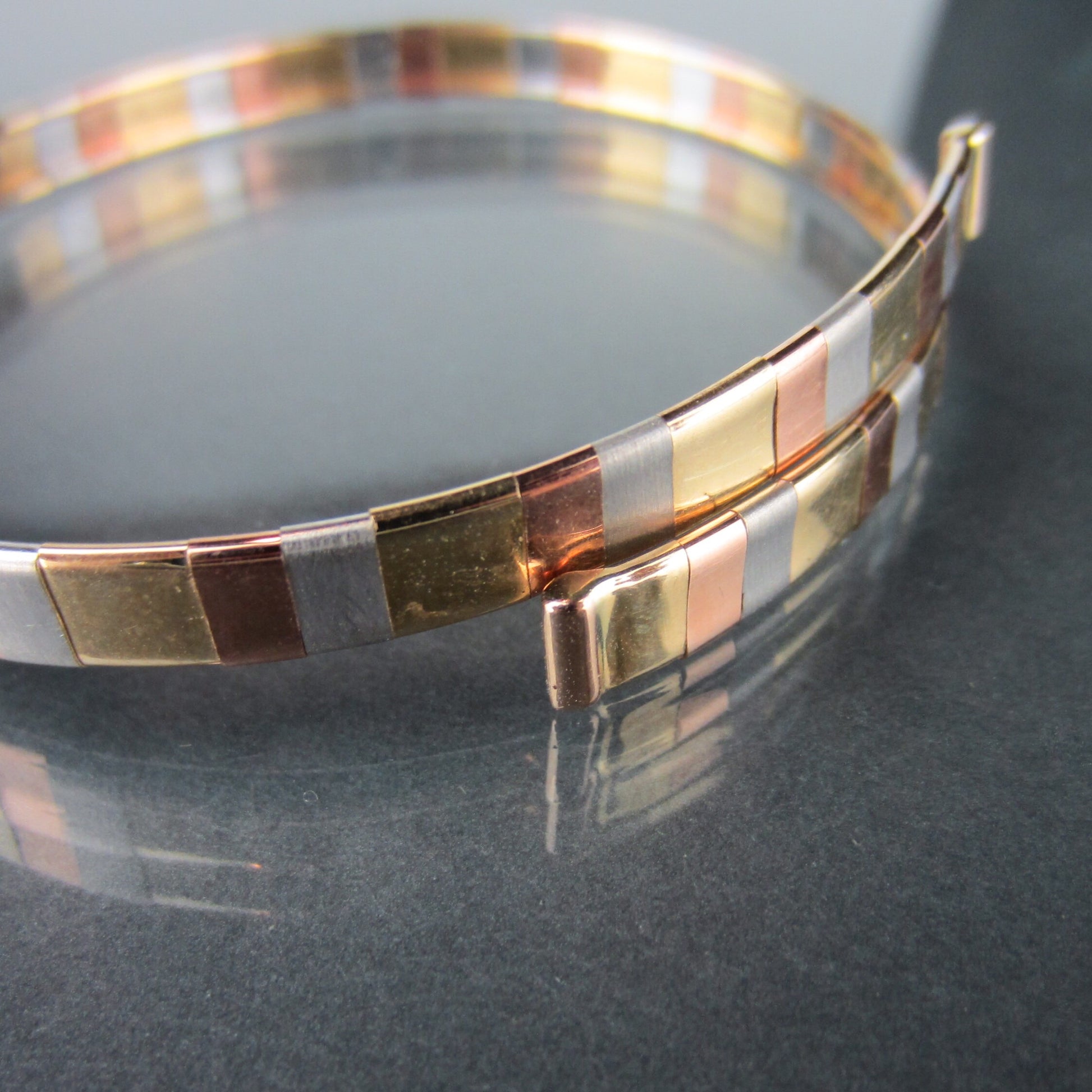 This incredibly sexy and chic coil bracelet was made circa 1980's and features the iconic tri-gold of the era--with white, yellow and rose gold segments forming this flexible bangle. Looks amazing on and works stacked or alone!