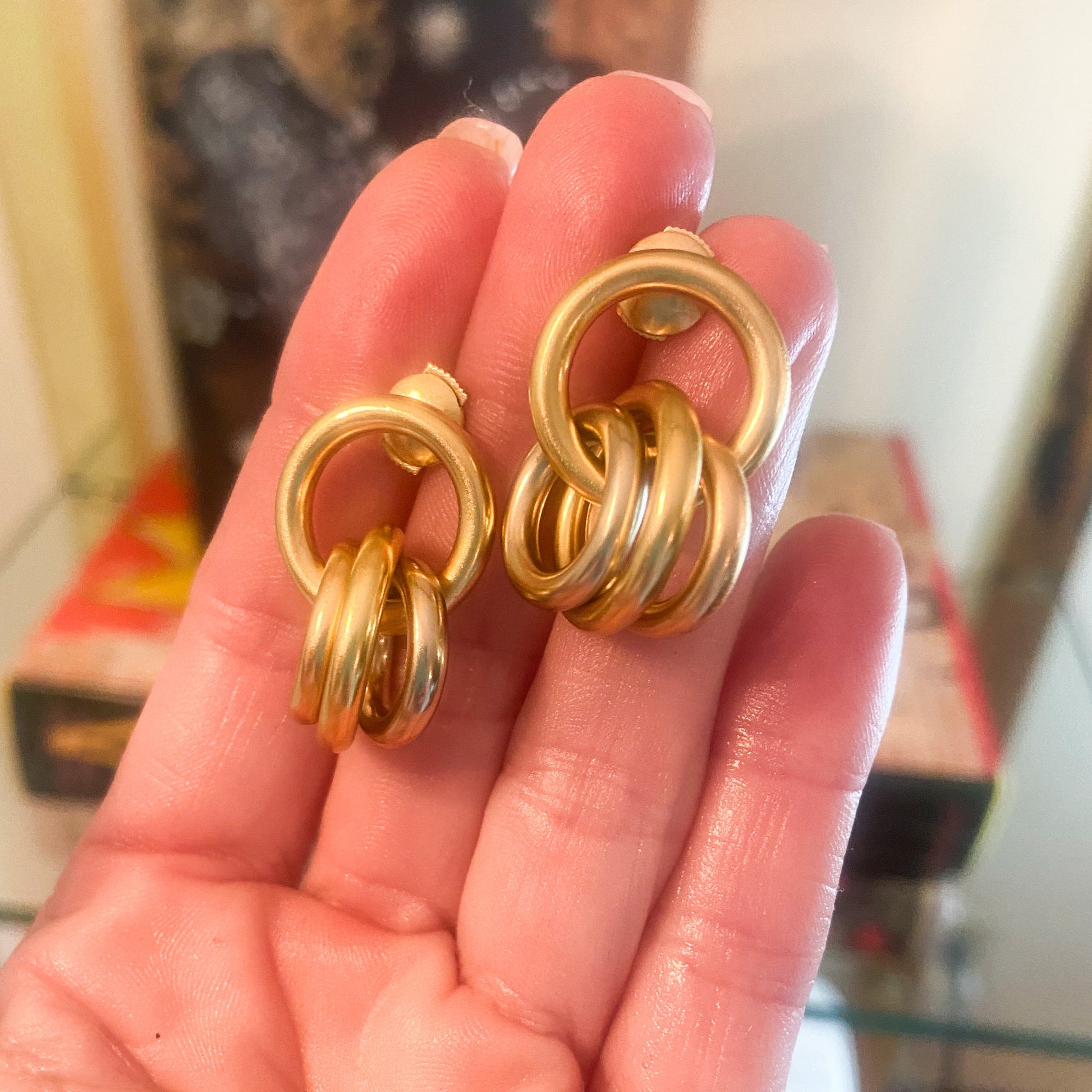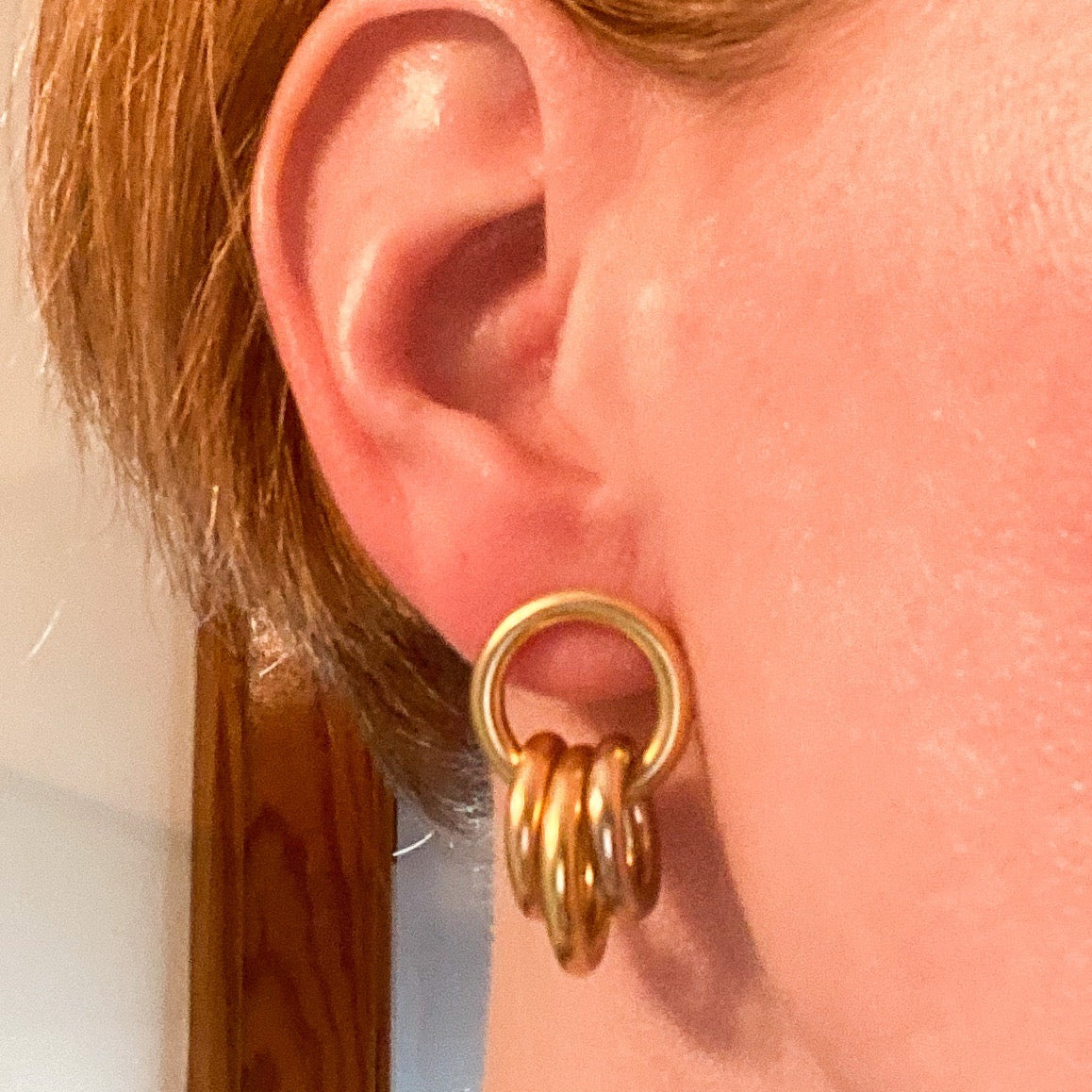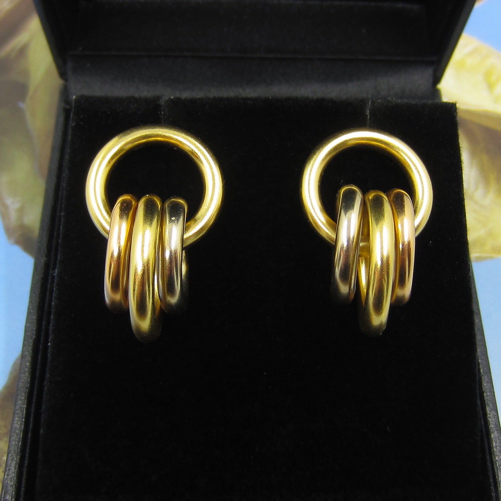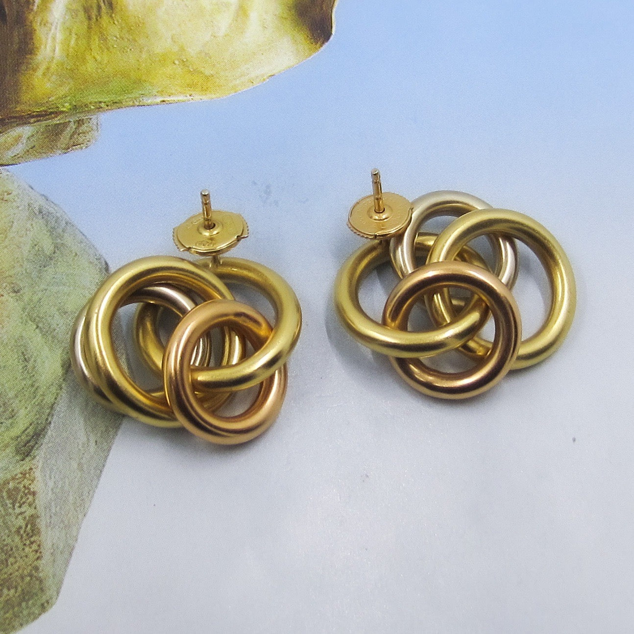 Stop me before I keep these ultra chic earrings for myself!! Ugggh they're so good--these gorgeous earrings were made circa 1990's and consist of a front-facing yellow gold ring with three interlocked rings of yellow, rose and white gold. All in 18k. They have a big presence but they're light enough to wear all day. Safety backs for extra security. Fabulous!