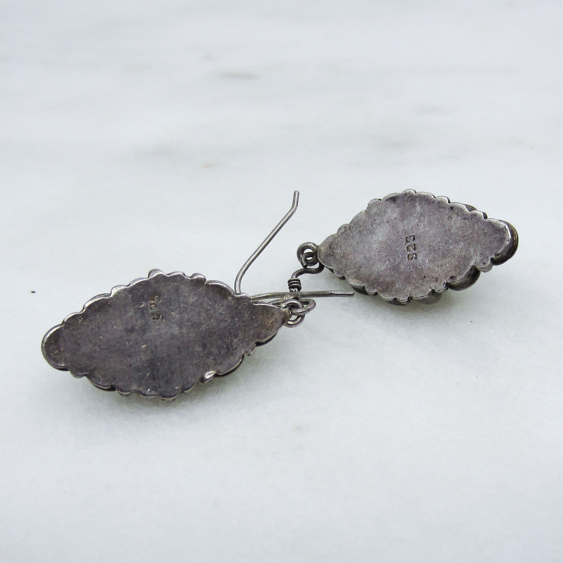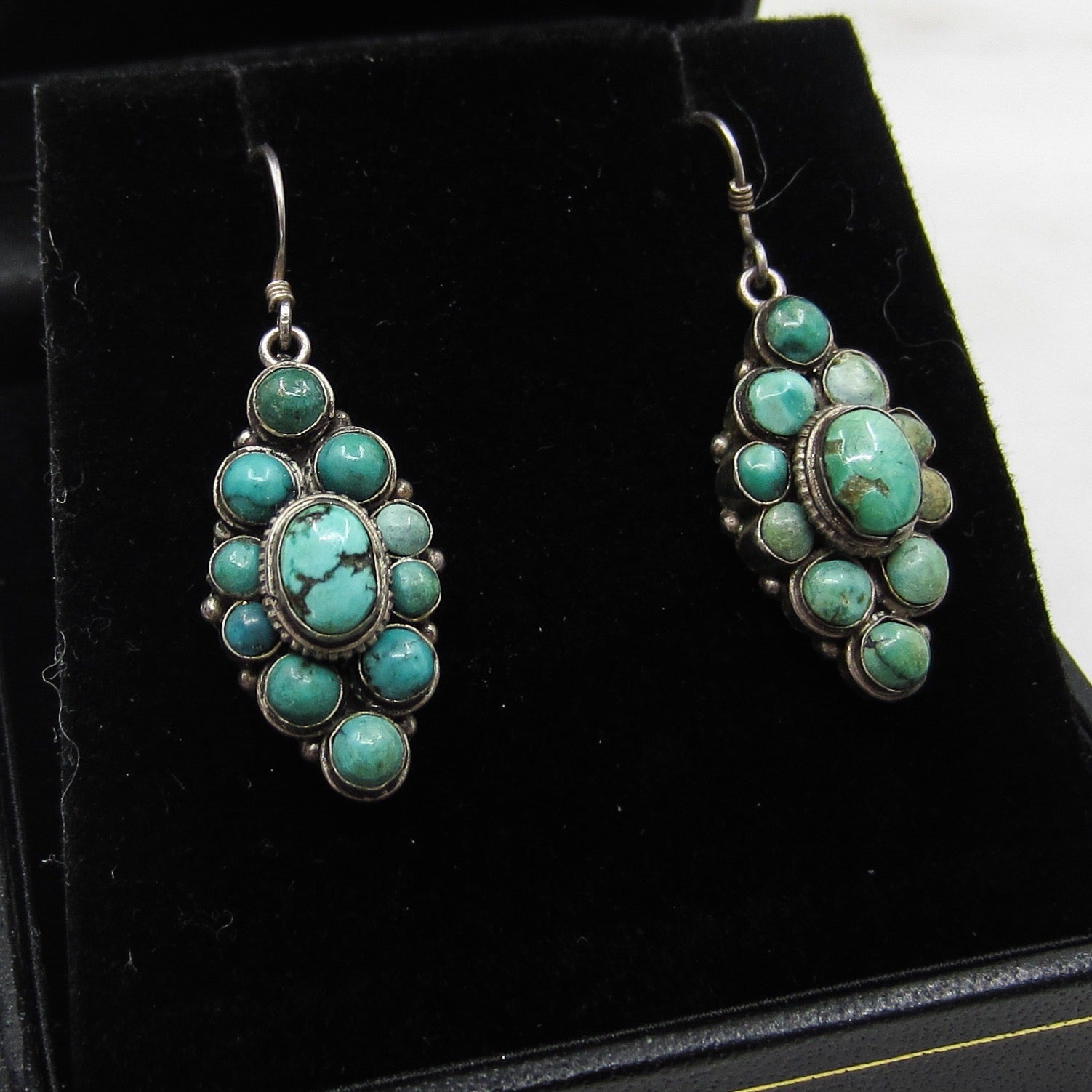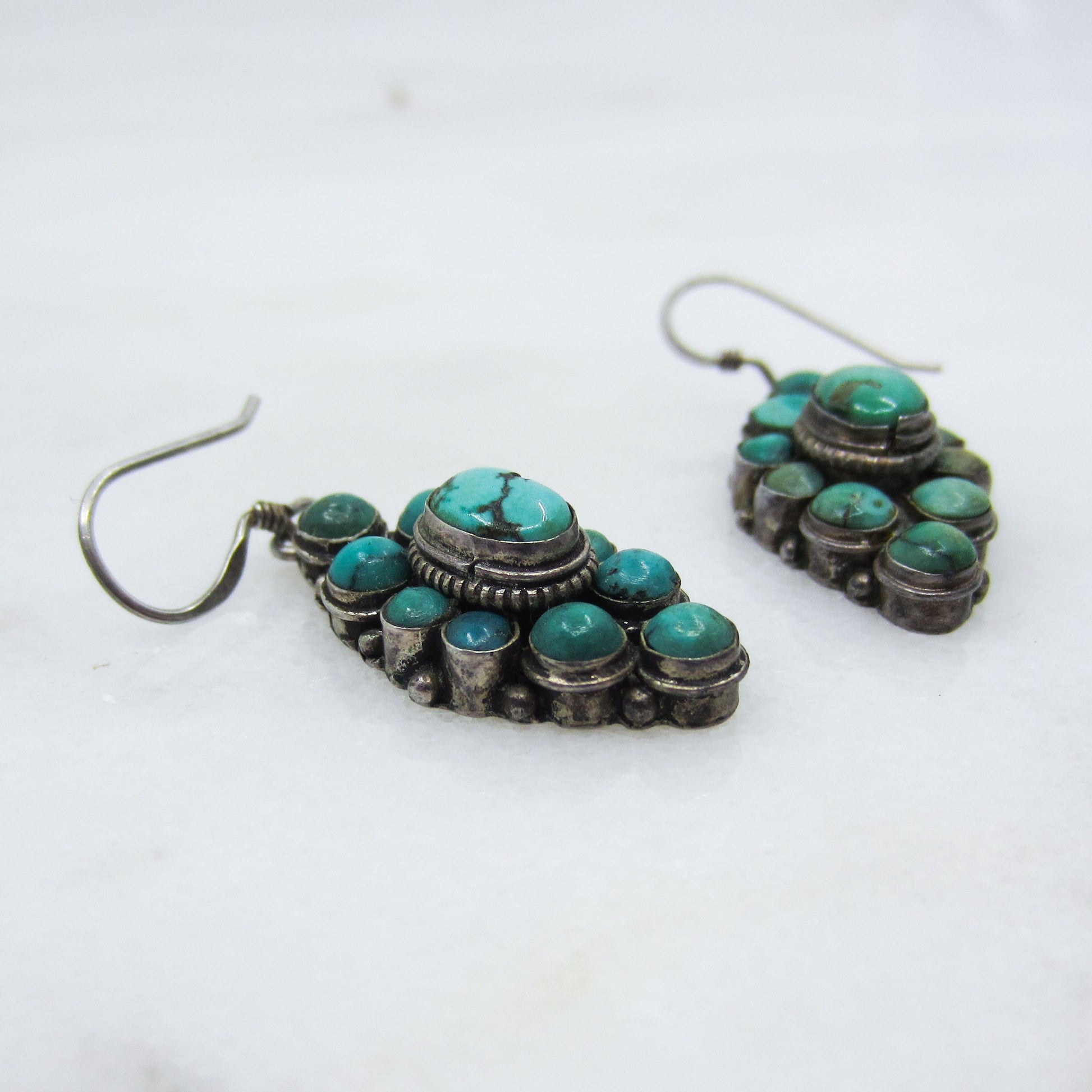 For the turquoise lover, you will get so much use out of these wearable vintage earrings! Designed as a navette shaped cluster of bezel set, vibrant blue-green turquoise and set in sterling silver circa 1970.