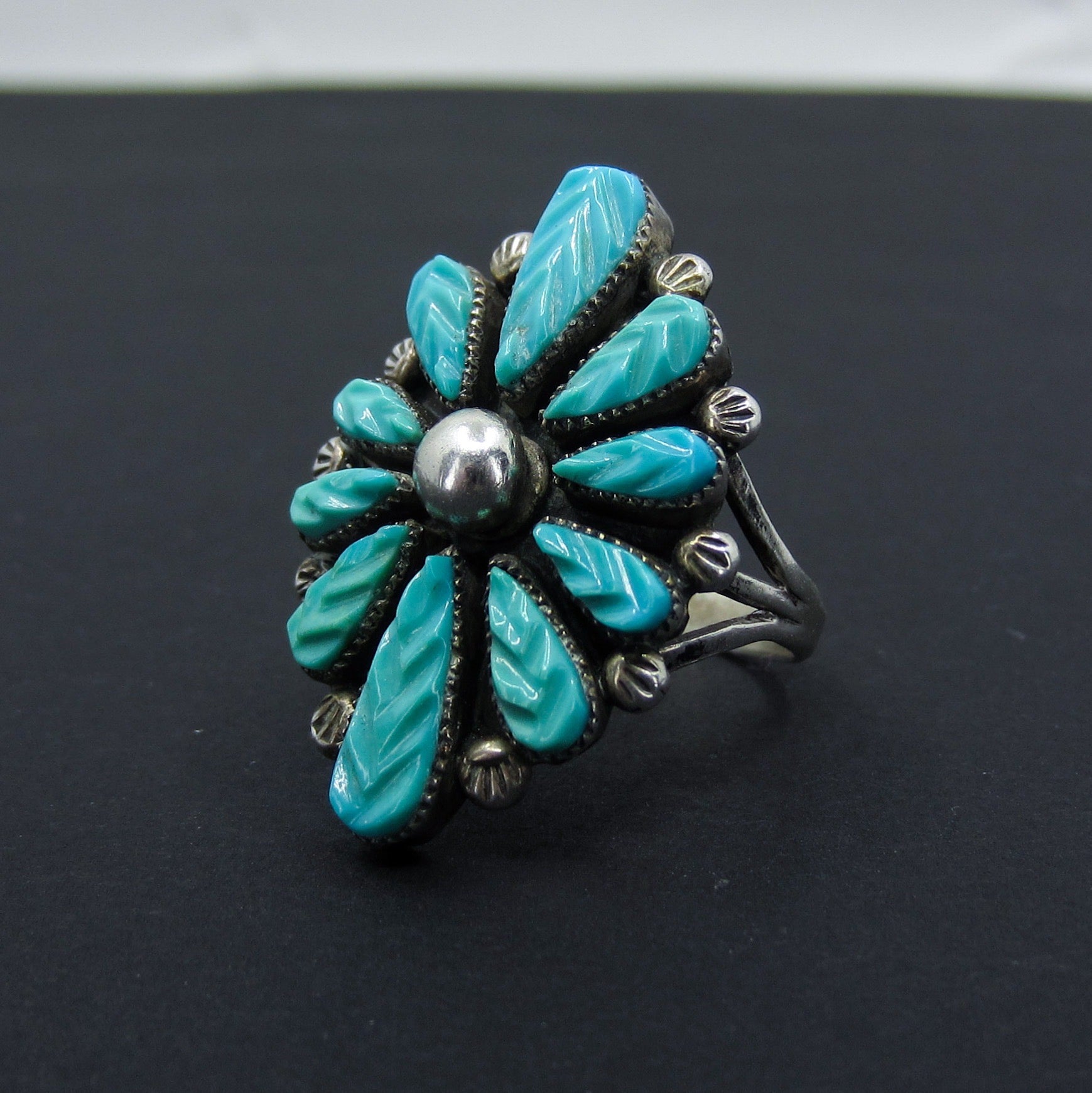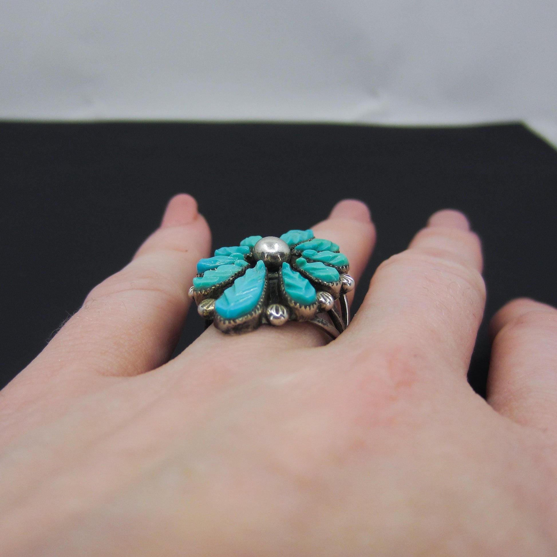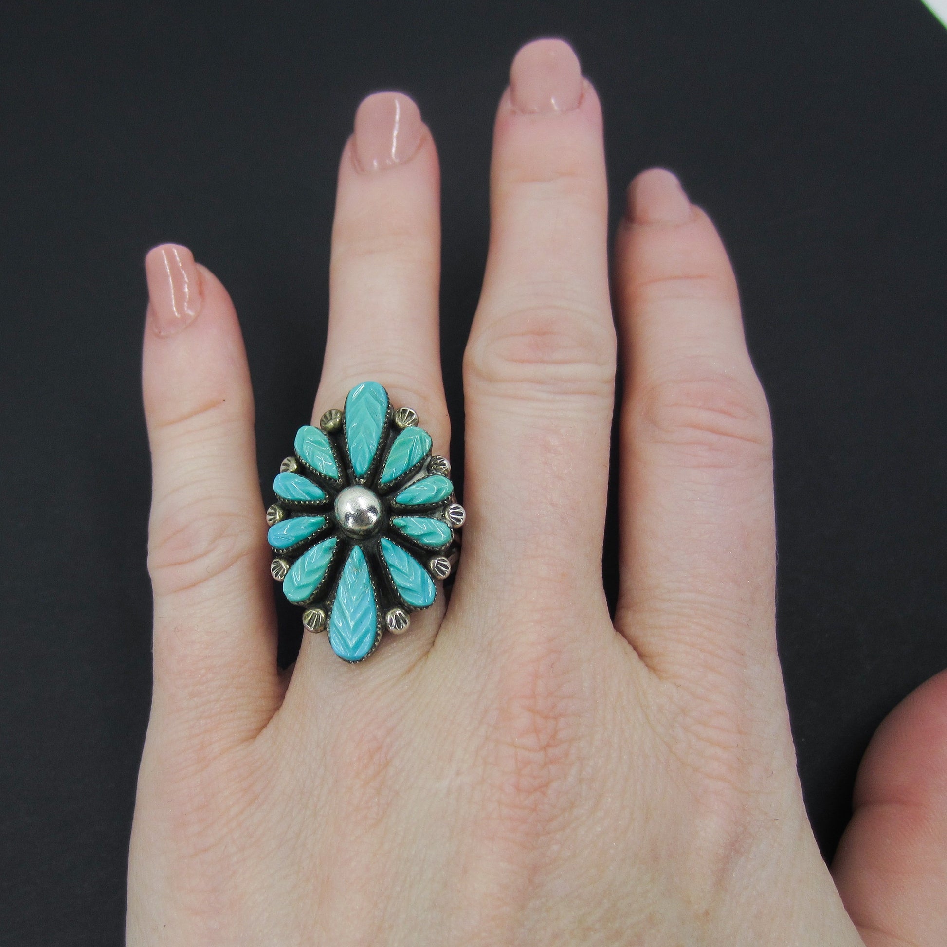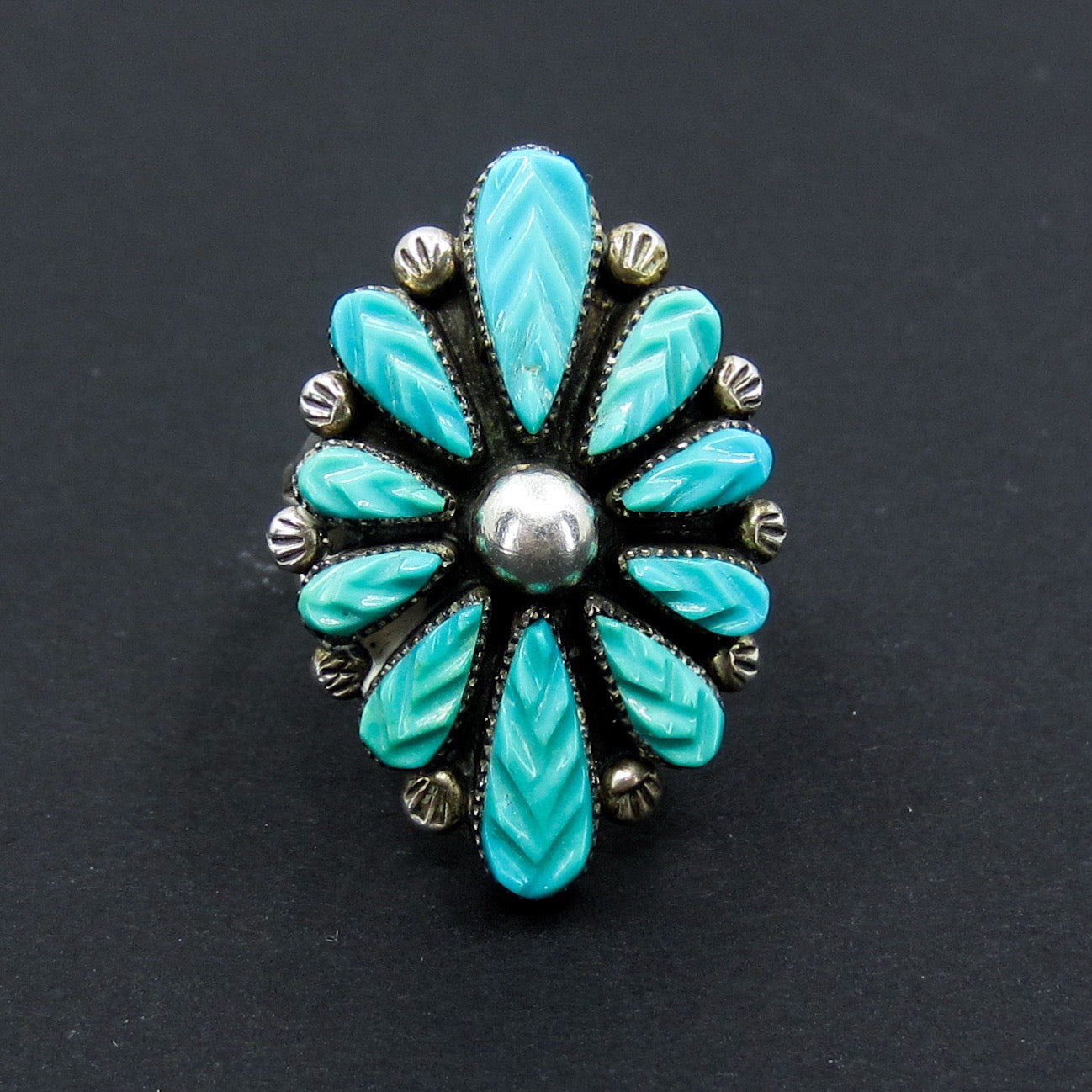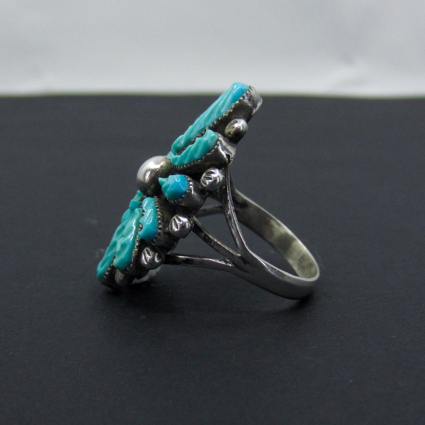 SOLD--Vintage Zuni Carved Turquoise Petit Point Ring Sterling c. 1970