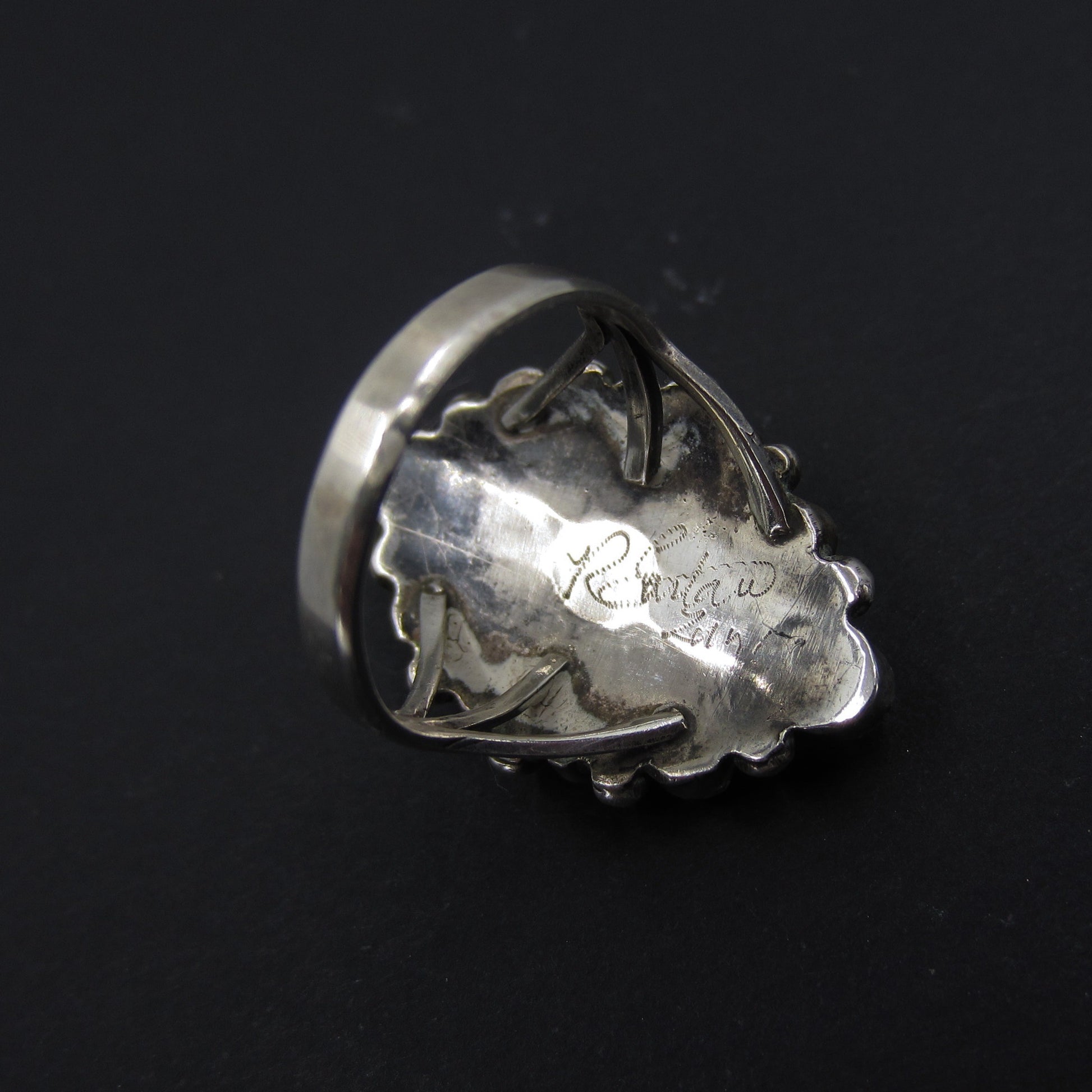 This striking Zuni made ring features textured carved turquoise pear shaped stones set in the petit point style and made in sterling silver circa 1970.